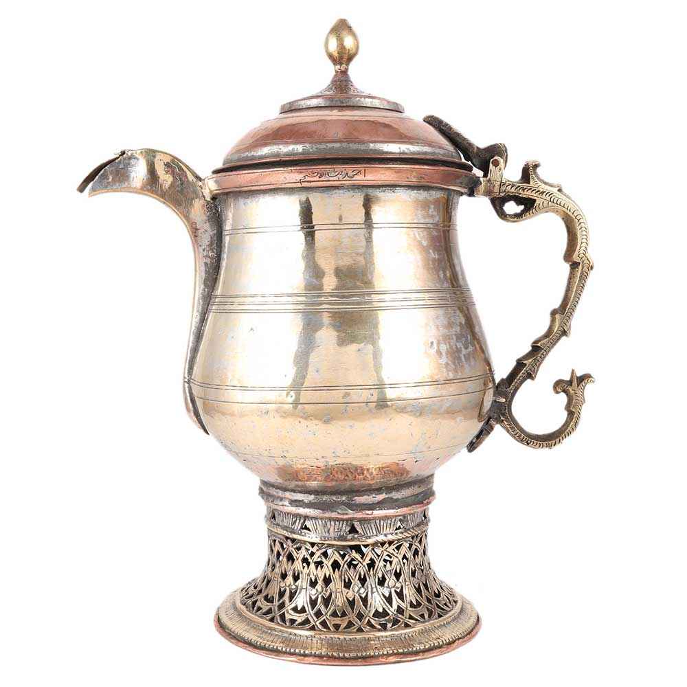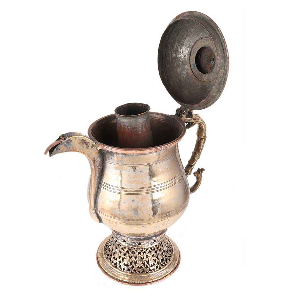 Here is a lovely late nineteenth century hand-chased ornamental water kettle, Tea or Coffee pot. The pot is a samovar, with a tin-lined section for pouring water and an inner chamber for burning wood to boil water, with perforations around the base allowing air to sustain the burning. It is most likely from Persia or Kashmir, and it is made of copper with a brass handle and cap.