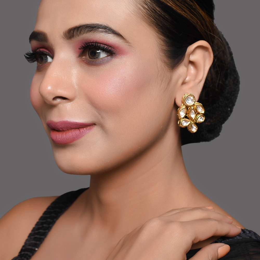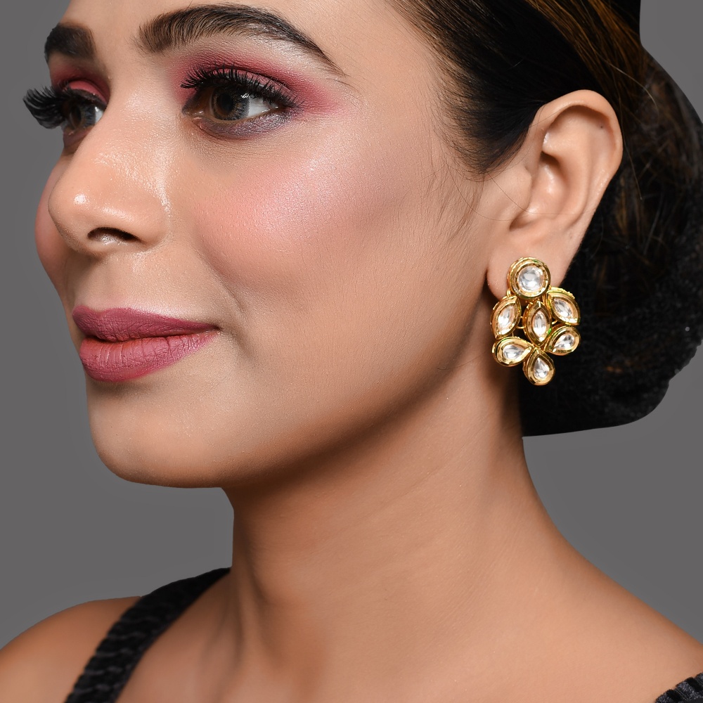 The Petal Cluster Mirror Stud Earrings with Gold Tone Finish are designed to offer subtle radiance with refined floral detailing. Crafted in golden brass, these earrings feature clustered petal motifs adorned with luminous white mirror stones that catch light beautifully. The compact 1.25-inch silhouette ensures a graceful presence without overpowering your look. Inspired by traditional Indian jewelry artistry, this pair blends heritage charm with everyday versatility.
