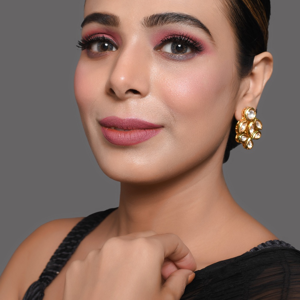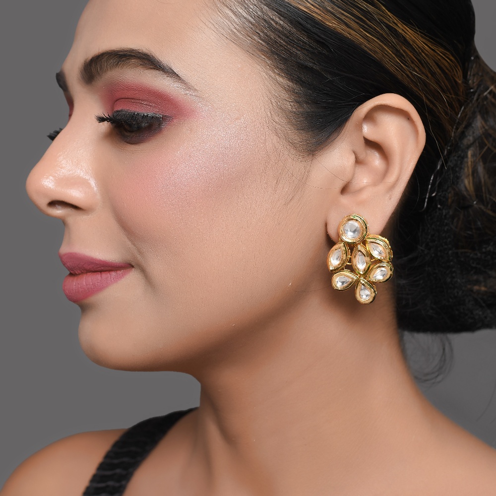 Delicate yet eye-catching, these petal cluster mirror stud earrings are crafted to bring a soft floral sparkle to your look. The design features a central mirror stone framed by marquise-shaped petal accents, creating a compact flower-like silhouette that catches light beautifully while staying easy to wear. Design Highlights Hand-finished by artisans, this pair balances traditional mirror detailing with a neat, modern stud profile. Floral-inspired cluster made with mirror-style stones Marquise petal accents arranged around a luminous centre Compact stud form for comfortable, all-day wear Warm gold-tone frame that enhances the reflective stones Carefully assembled using traditional jewellery techniques Materials & Finish Material: Metal alloy with mirror-style stones Colour: Gold tone with reflective clear stones Design: Petal cluster stud earrings with floral silhouette Origin: Handmade in India and individually quality-checked Subtle variations may occur due to handcrafted workmanship Styling Notes Ideal for festive wear, weddings, and family celebrations Pairs well with chokers, collar necklaces, and ethnic outfits Adds a graceful highlight without overpowering the face Care Instructions Store in a dry pouch away from moisture and perfumes. Wipe gently with a soft cloth after use to maintain shine and clarity. Artisan Craftsmanship This jewellery piece is assembled entirely by hand. Never machine-made, each pair reflects its own unique artisanal character.