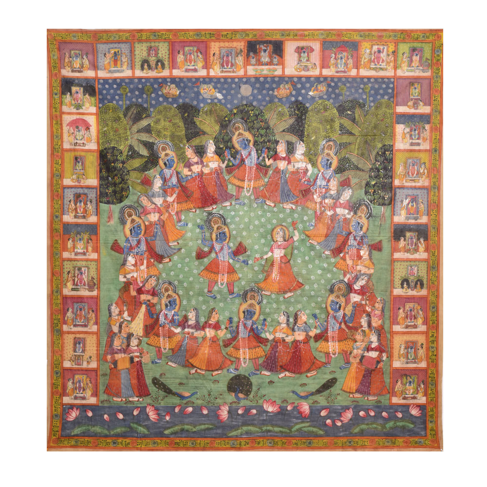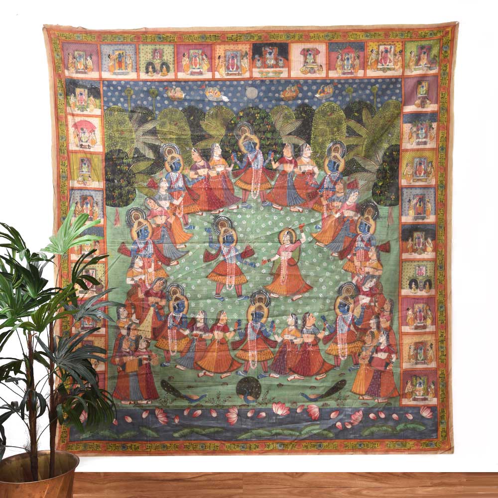 Pichwai painting is a traditional Indian art genre known for representing episodes from the life of Lord Krishna, a renowned Hindu deity. The Rasleela, a cosmic dance performed by Lord Krishna with the gopis or cowherd females of Vrindavan, is one of the most memorable episodes of his life. Krishna Rasleela's Pichwai painting captures the spirit of this magnificent dance and is a lovely portrayal of India's rich cultural history. Lord Krishna is shown as a youthful and playful god, surrounded by gopis in various stances, dancing and singing in joy. The painting's composition revolves around Lord Krishna, represented in his trademark blue skin, playing his flute and surrounded by gopis. The gopis are seen in bright saris dancing around Lord Krishna, engrossed at the moment. The artwork's backdrop is loaded with detailed features, such as trees, flowers, and animals, which give the image depth and substance. The painting's bold and brilliant colours, red, yellow, and green, dominate the composition. The artwork reflects Rasleela's exuberant energy, with Lord Krishna and the gopis caught up in the holy bliss of the dance. Krishna Rasleela's Pichwai painting is a timeless piece of art that reflects the beauty of Indian culture and its rich creative legacy. It is a monument to the painters' ability and ingenuity and a reminder of Hindu mythology's deep spiritual foundations.