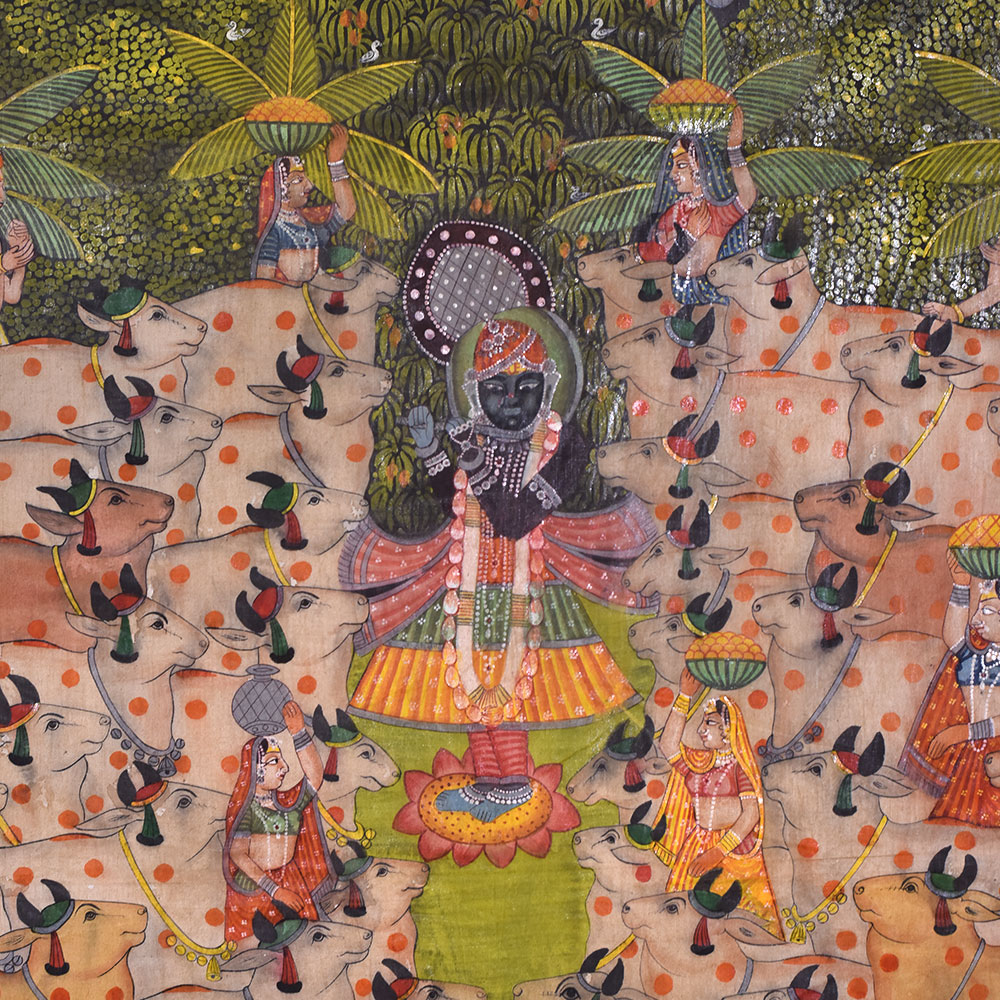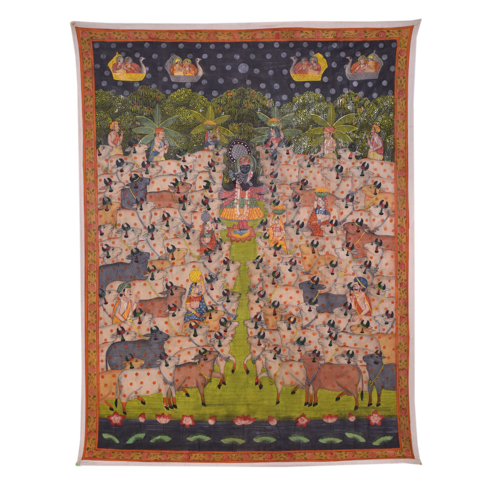 Rajasthan's Pichwai Cow Painting of Shreenathji on Sharad Purnima are a traditional type of art that represent incidents from Lord Krishna's life. One of the most well-known Pichwai paintings depicts Shreenathji, an avatar of Lord Krishna, with cows on the festival of Sharad Purnima. Sharad Purnima is a Hindu holiday held in the month of Ashwin, which falls in October or November. The moon is said to be closest to the earth on this day and to shine brightly. Lord Krishna, according to mythology, used to celebrate this occasion by playing his flute and dancing with the Gopis in the moonlight. This celebration is vividly shown in the Pichwai art of Shreenathji with cows on Sharad Purnima. Shreenathji is seen in the picture standing in the center, surrounded by cows. The backdrop is painted in blue tones to reflect the night sky, and the moon is seen shining brightly. Shreenathji is pictured playing his flute while the cows watch. The artwork depicts the beauty and peacefulness of the occasion and is a visual expression of Shreenathji's intimate affinity with the cows. Cows are revered in Hindu mythology and are considered sacred creatures. They are thought to symbolize motherly love, selflessness, and purity. The cows in the Pichwai picture of Shreenathji with cows on Sharad Purnima are completely dedicated to Shreenathji and are attentively listening to his singing. Finally, the Pichwai cow painting of Shreenathji on Sharad Purnima is a lovely depiction of the event and the close link between Shreenathji and the cows. The picture depicts the moment's beauty and tranquillity and serves as a reminder of the value of love, devotion, and nature in Hindu philosophy.