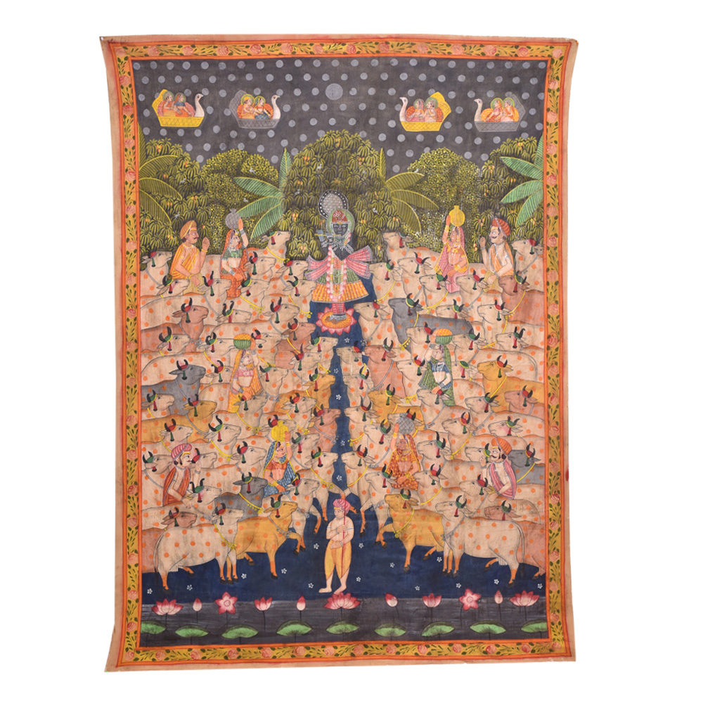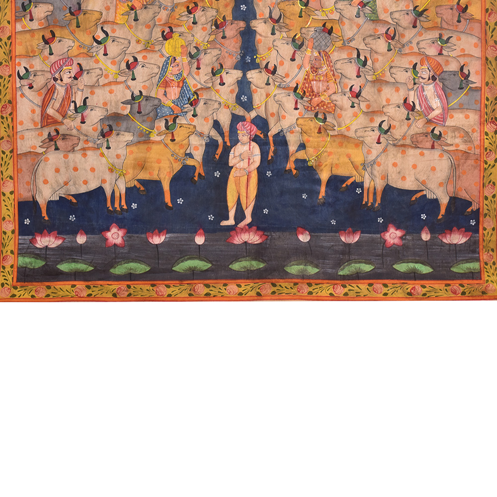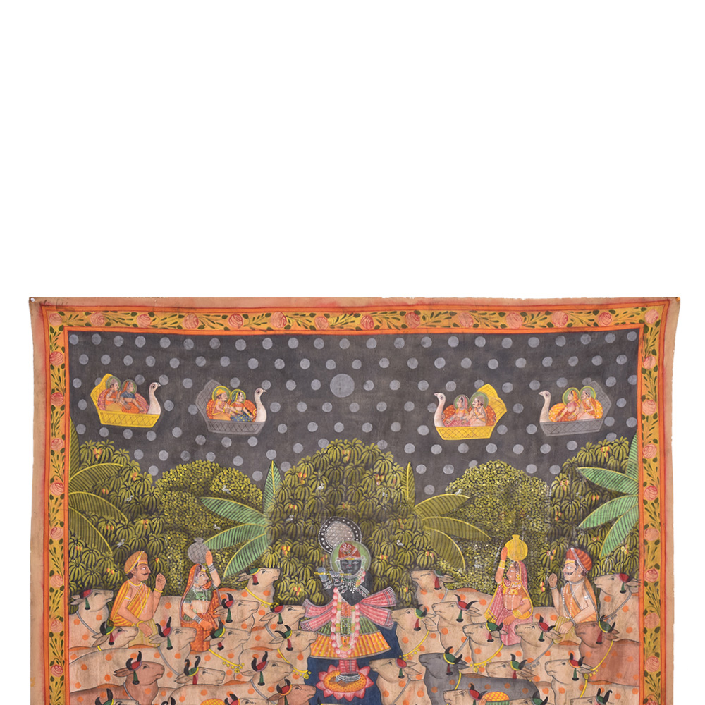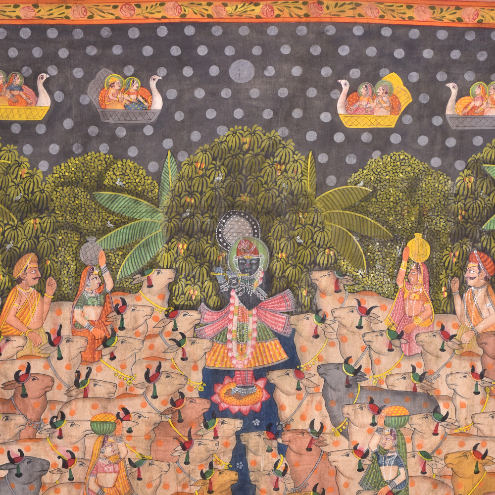 Shrinathji, magnificent in all his chaubis swaroop is seen at manorath a special service held during the Gopashtami festival to commemorate Lord Krishna's transformation into a full-fledged cowherd. Shrinathji is seen in the pichwai wearing a crown and a specially embellished skirt for the occasion.