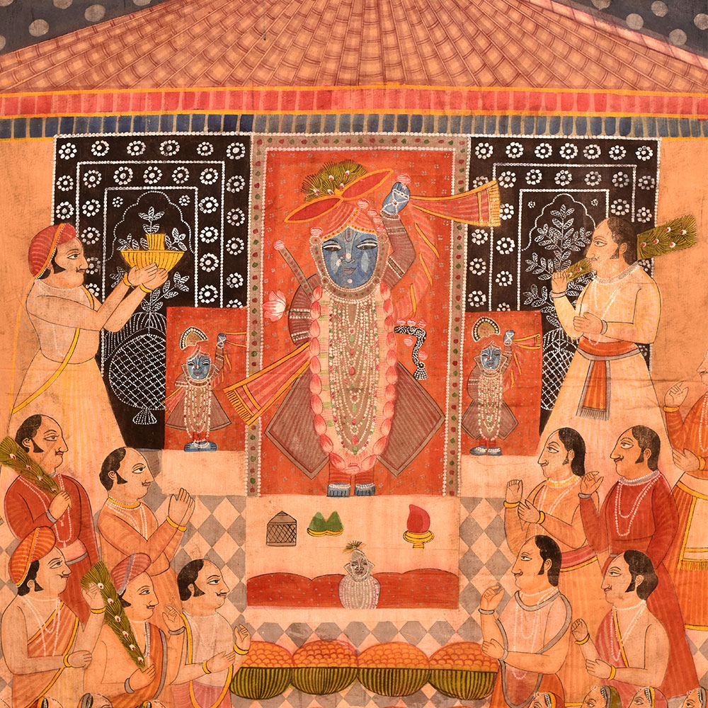 Pichwai Painting Of Sreenathji Annakut Festival is a distinct and lively art style developed in Rajasthan's holy town of Nathdwara. Annkut, or Annakut, is a Hindu festival that marks the beginning of the Hindu New Year. It is a day of offerings and feasting, with the making of Annkut paintings being one of the most prominent components of the celebration. Lord Krishna, also known as Shrinathji, is generally shown in various shapes and attitudes in Shrinathji Annkut paintings. They are distinguished by complex features and vivid colours, and they frequently depict representations of fruits, vegetables, sweets, and other culinary items donated to the god during the festival. Shrinathji Annkut paintings are famous for adorning homes, temples, and other holy venues due to their brilliant colours and meticulous detailing. These are frequently presented during the Annkut festival to show thanks and devotion to Lord Krishna. Shrinathji Annkut paintings are valued as works of art in addition to their religious importance. Several artists have altered the classic shape to produce new and unique creations that integrate contemporary methods and styles. Although keeping the core of the traditional form, these recent Annkut paintings frequently contain abstract motifs and vivid colour combinations.