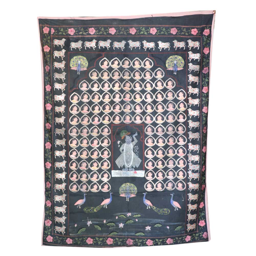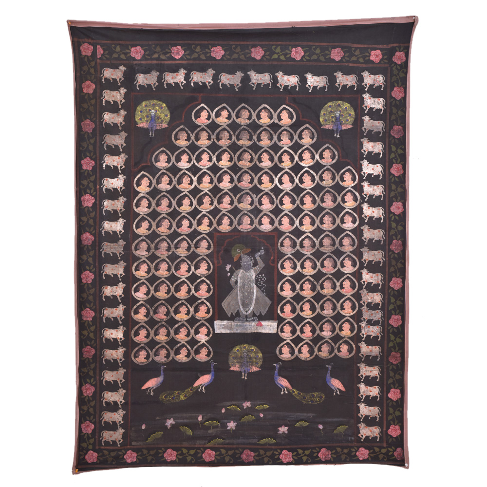 Sreenathji Pichwai on black cloth with face motifs is created by devotee-artists of Nathwara a very popular wall decoration for his home, hotel and lobby decoration, temple decoration, conference hall, resort , Diwali gift, house warming gift and stage decoration.