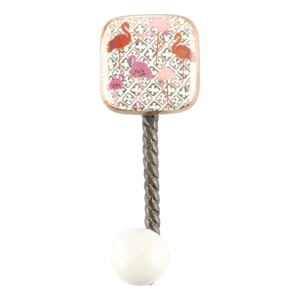 Pink and Gold Flamingo Square Ceramic Wall Hook in Antique Fitting. A Perfect Complement to the Soft Tone of the Wood are these White Traditional Hat and Coat Hook Made of Genuine Porcelain. It can be use to Hang Jewellery, Leashes, Towels, Scarves, Light Weight Sweaters, Caps etc.