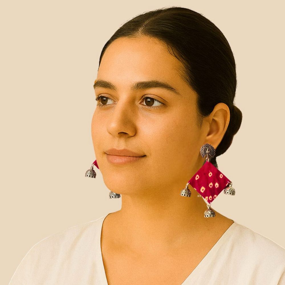 The Pink Bandhani Fabric Jhumka Earrings for Women celebrate India’s beloved tie-dye textile tradition in a classic, wearable form. Crafted on a fabric base, the Bandhani-inspired print brings cultural warmth and festive vibrance, while the jhumka silhouette adds timeless movement and elegance. The soft pink tone enhances the handcrafted feel, making the earrings expressive yet gentle. Designed for comfort and tradition, they suit both everyday ethnic wear and celebratory occasions.