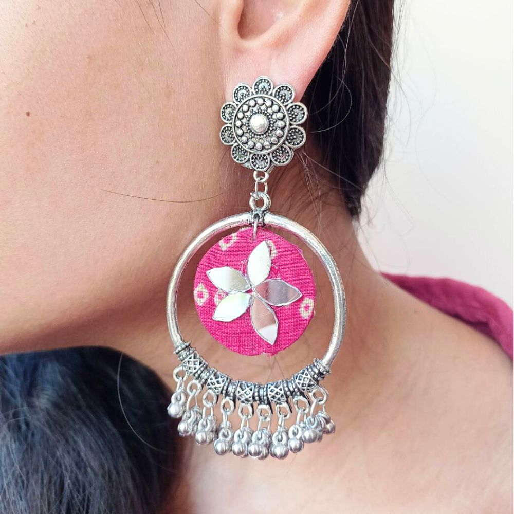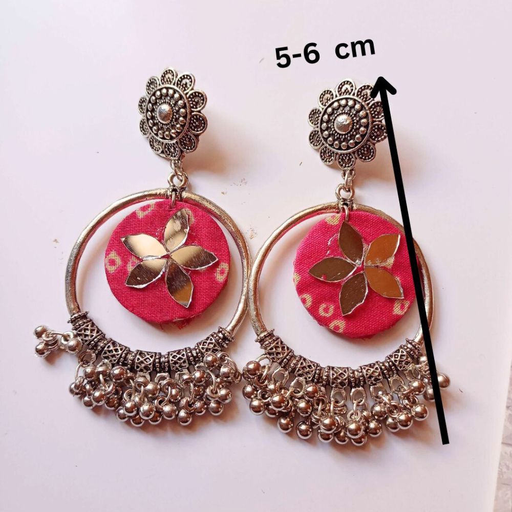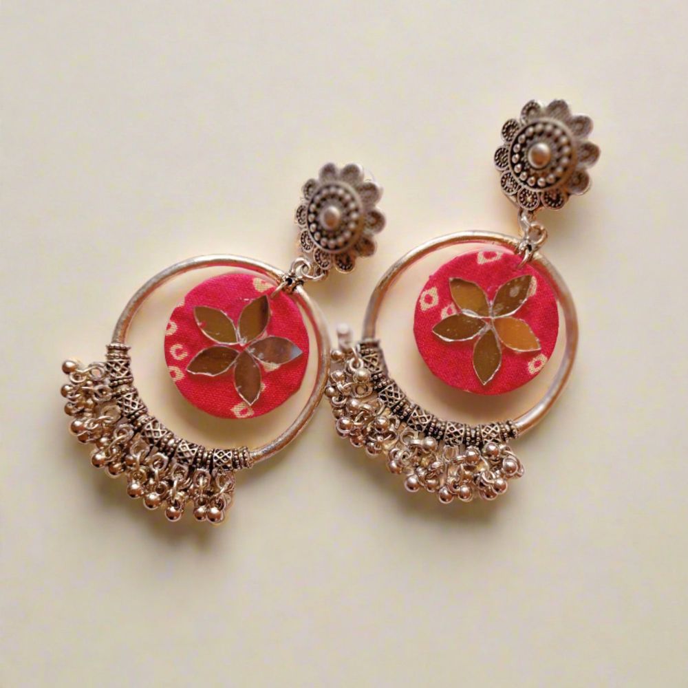 The Pink Bandhani Printed Fabric Bali Ghungroo Earrings bring together vibrant textile tradition and playful movement in a beautifully balanced design. Crafted on a fabric base, the classic Bandhani print adds cultural richness, while the circular Bali form keeps the look timeless. Finished with silver-toned ghungroo detailing, these earrings sway gently, creating a lively yet elegant presence. Designed to be lightweight and expressive, they are perfect for festive and everyday ethnic styling.