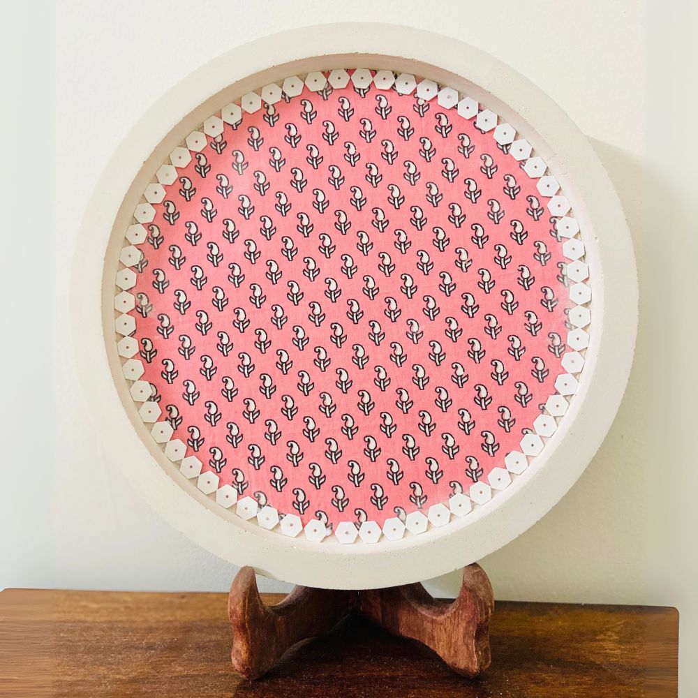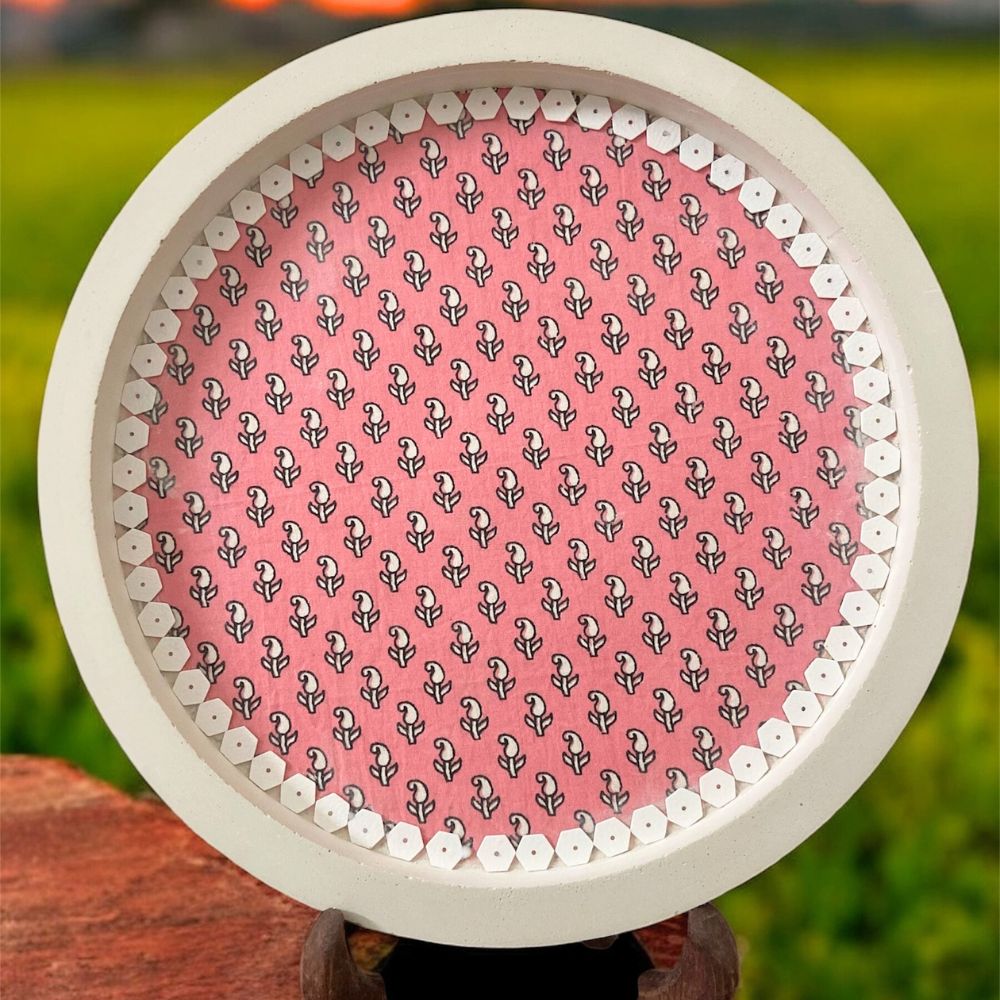 Brighten up your living space with this charming Pink Cemented Plate for Home Decor, adorned with a delicate floral block-print pattern. The vibrant pink base and geometric border detailing make it a perfect statement piece for modern as well as traditional interiors. Ideal for display on walls, shelves, or as a thoughtful artisan-made gift.