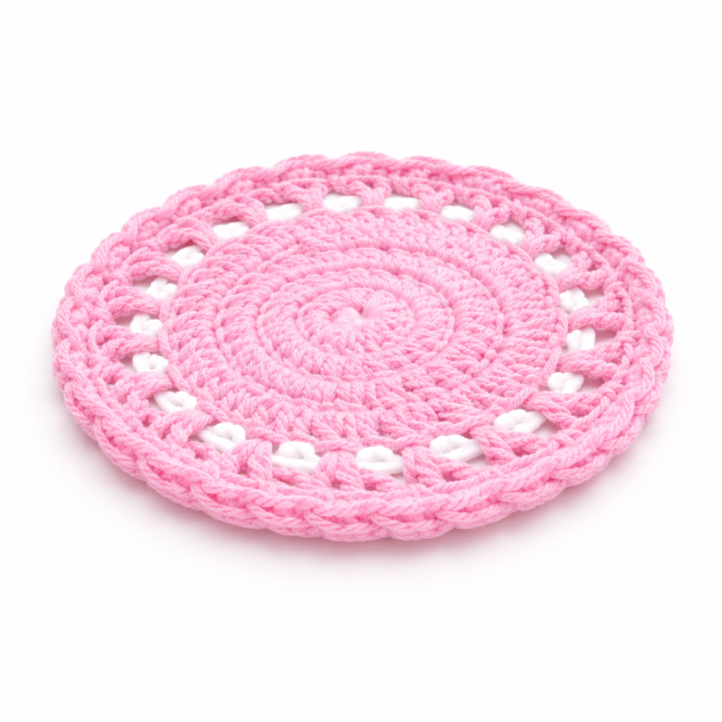 This pink crochet coaster is carefully handcrafted using premium cotton yarn and designed in a beautiful round doily pattern. The soft pink color brings a gentle decorative touch to coffee tables, dining tables, and tea setups while the crochet lace pattern reflects traditional handmade craftsmanship. Functional and decorative, this cotton yarn coaster helps protect surfaces from cup marks, heat, and moisture.