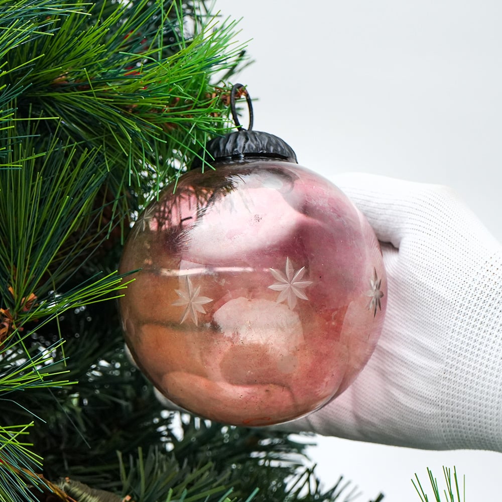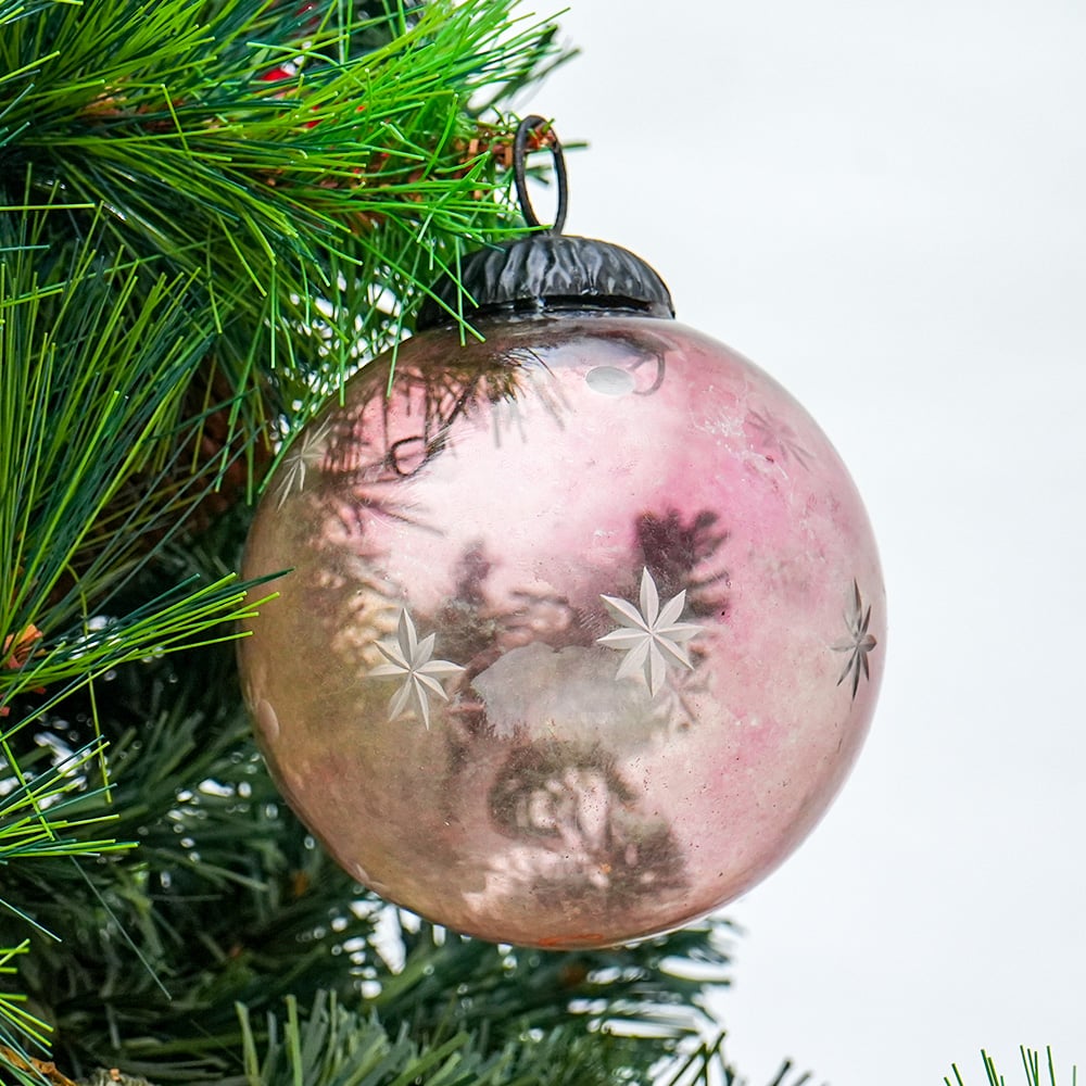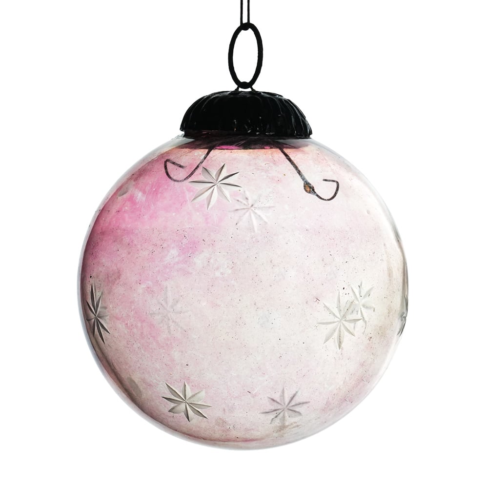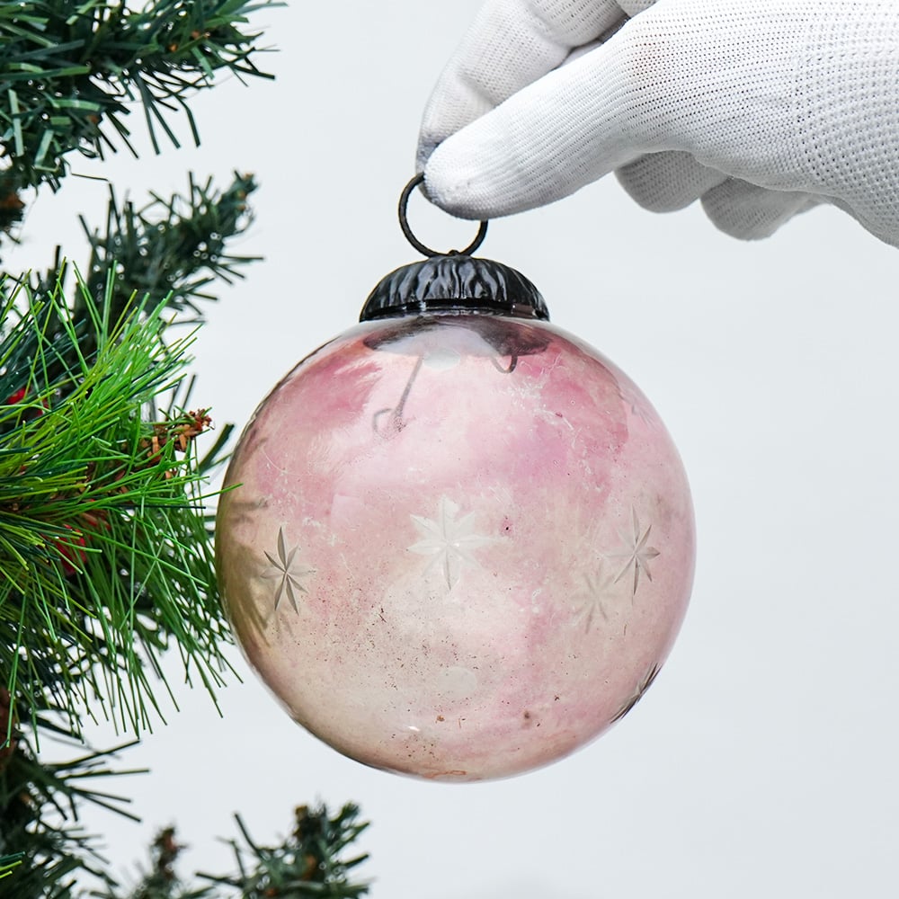 Pink Decorative Round Glass Hanging Ornament. Crafted from high-quality glass with a smooth glossy finish, this decorative bauble adds a classic and festive touch to Christmas trees, wreaths, and holiday displays.