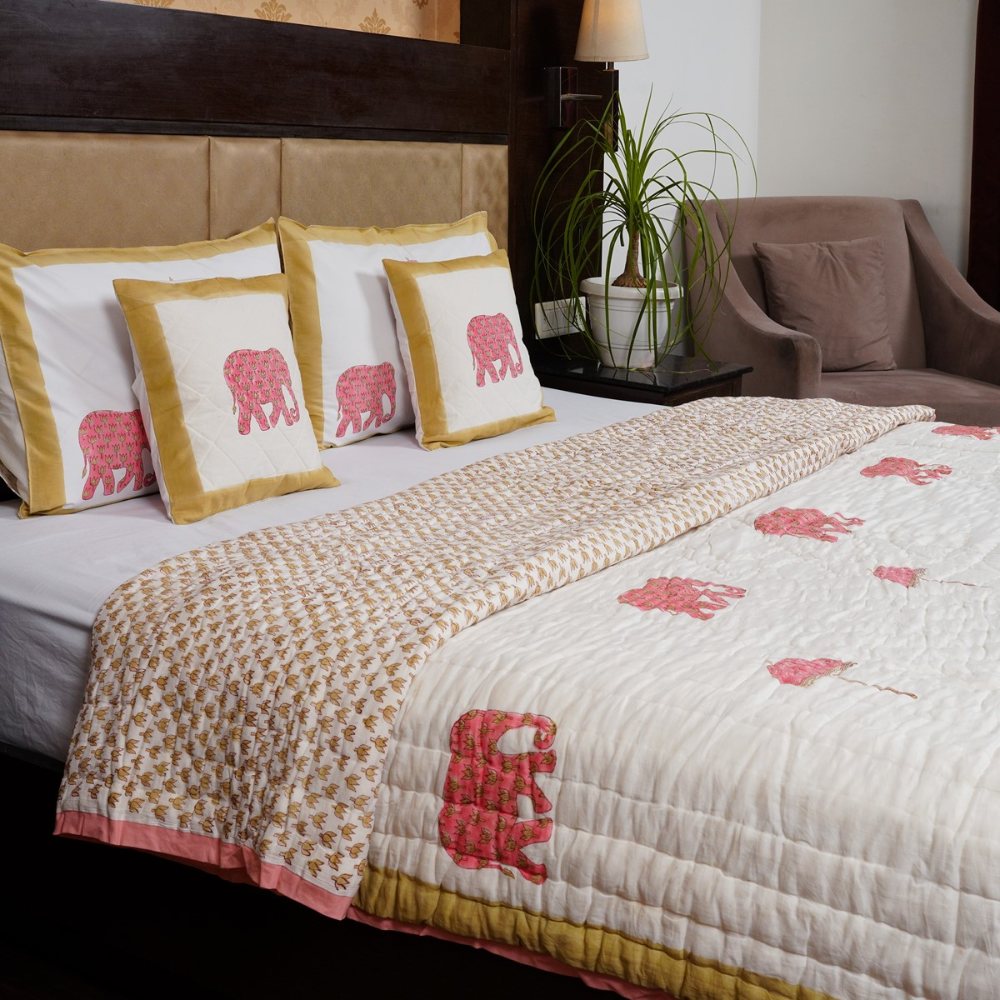 Add a touch of whimsy and Indian artistry to your décor with this handcrafted elephant print quilt — a blend of softness, comfort, and style.