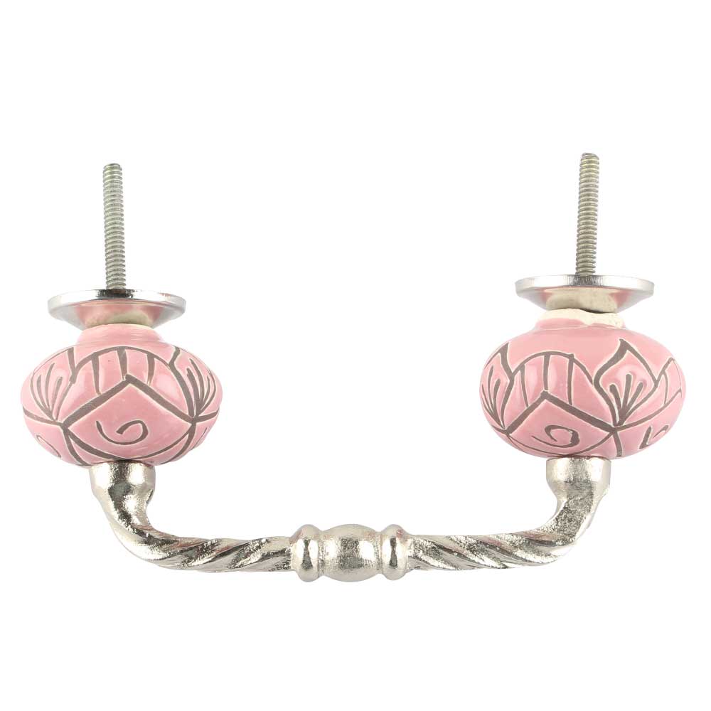 Pink Etched Ceramic Floral Cut Bridge Handle. Ideal for Drawer, Dresser, Cabinet, Wardrobe, Cupboard and Almirah etc.