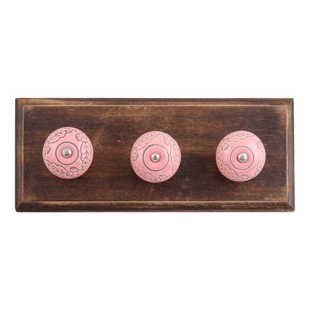 Pink Leaf Flower Etched Ceramic Wooden Hook. A Perfect Complement to the Soft Tone of the Wood are these White Traditional Hat & Coat Hook Made of Genuine Porcelain and Brass. It can be use to Hang Jewellery, Leashes, Towels, Scarves, Light Weight Sweaters, Caps Etc.