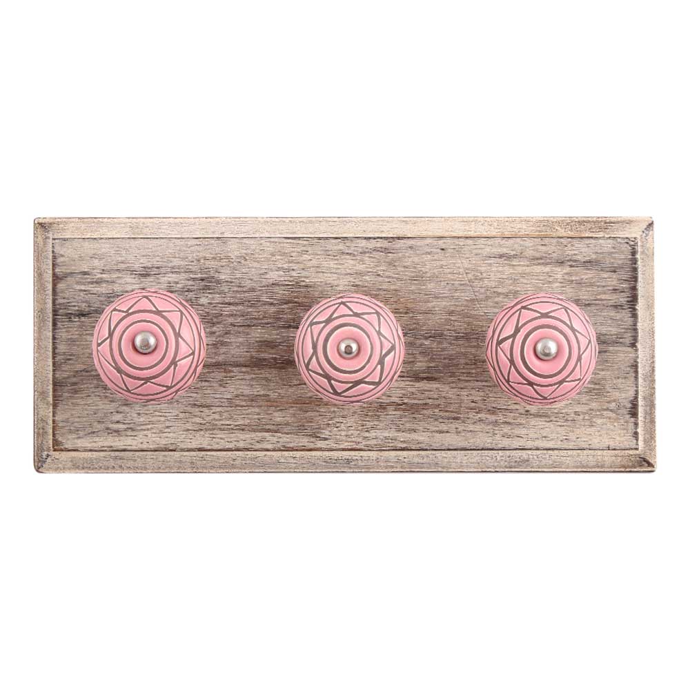 Pink Pattern Etched Ceramic Wooden Hook. A Perfect Complement to the Soft Tone of the Wood are these White Traditional Hat & Coat Hook Made of Genuine Porcelain and Brass. It can be use to Hang Jewellery, Leashes, Towels, Scarves, Light Weight Sweaters, Caps Etc.