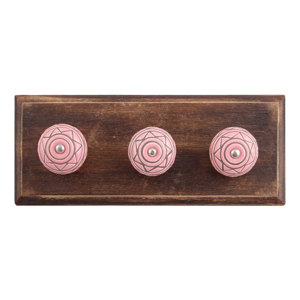 Pink Pattern Etched Ceramic Wooden Hook. A Perfect Complement to the Soft Tone of the Wood are these White Traditional Hat & Coat Hook Made of Genuine Porcelain and Brass. It can be use to Hang Jewellery, Leashes, Towels, Scarves, Light Weight Sweaters, Caps Etc.
