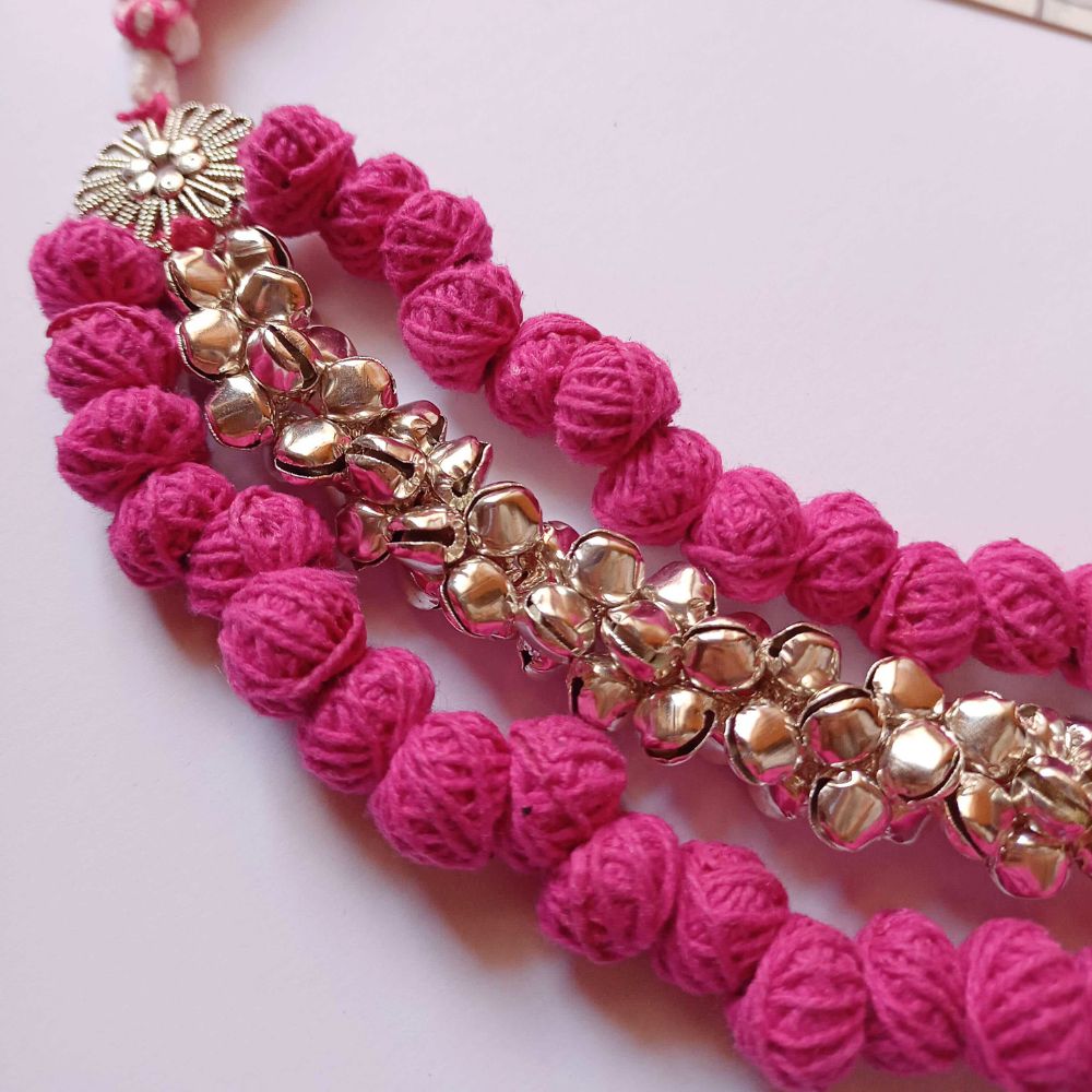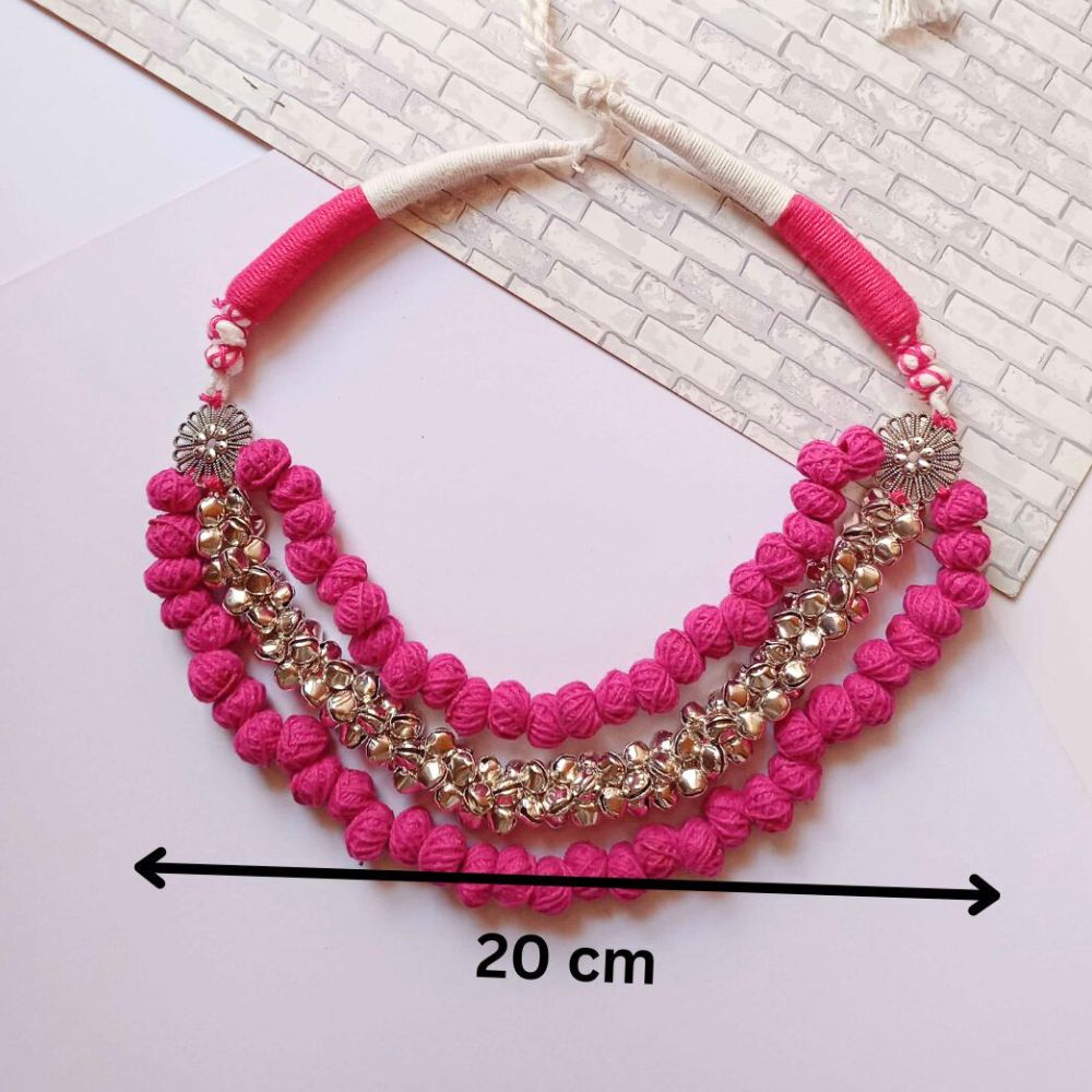 The Pink Pom Pom Ghungroo Choker Plus Long Necklace is a joyful blend of movement, color, and traditional detailing. Crafted on a fabric base, soft pink pom poms create a playful, tactile rhythm, while silver-toned ghungroo accents add gentle shimmer and sound. Designed to be worn as a close choker or styled as a longer necklace, this versatile piece adapts effortlessly to festive and fusion looks. It reflects artisan-inspired creativity rooted in Indian celebratory jewellery traditions.