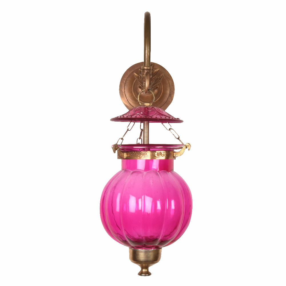 Pink pumpkin shaped glass hanging lamp on leafy bronze bracket. The lamp is unique and allows a great lighting option for any room.