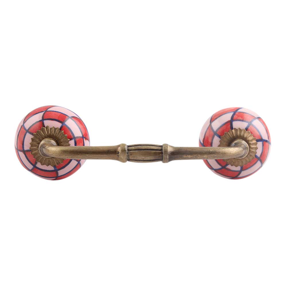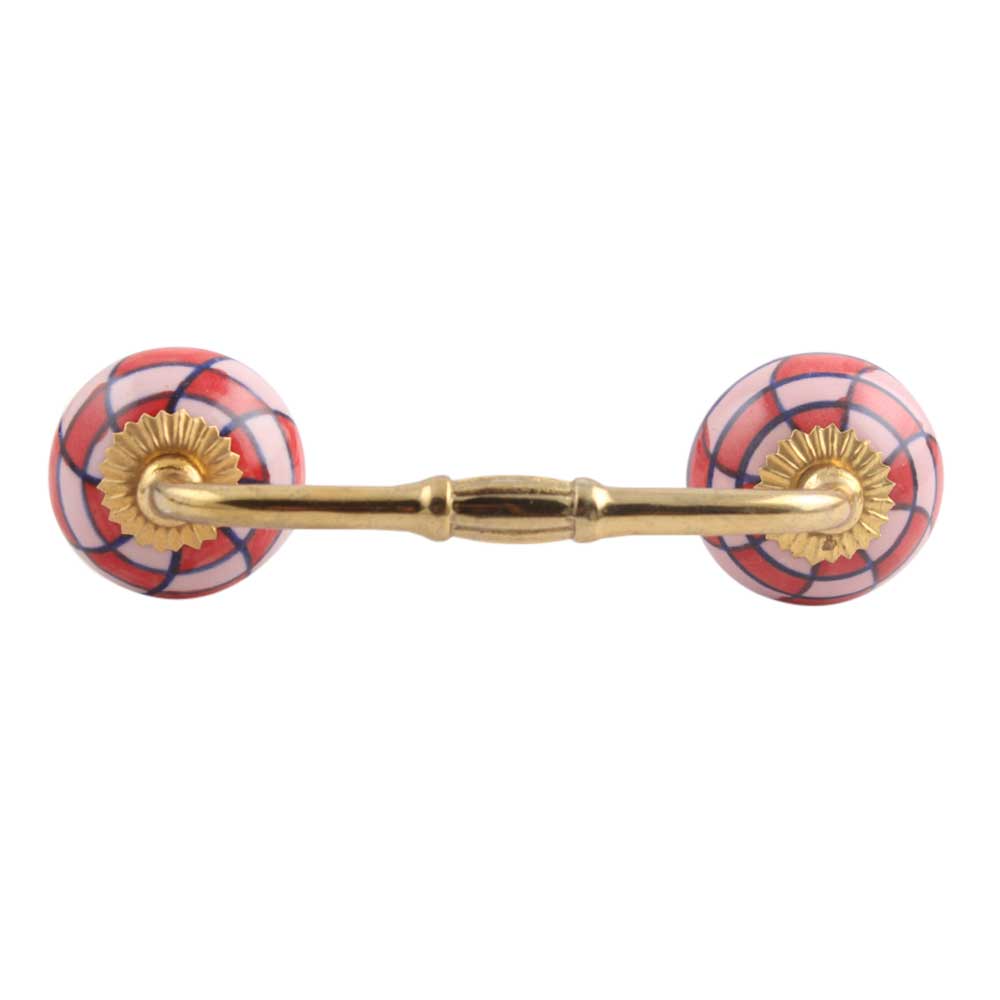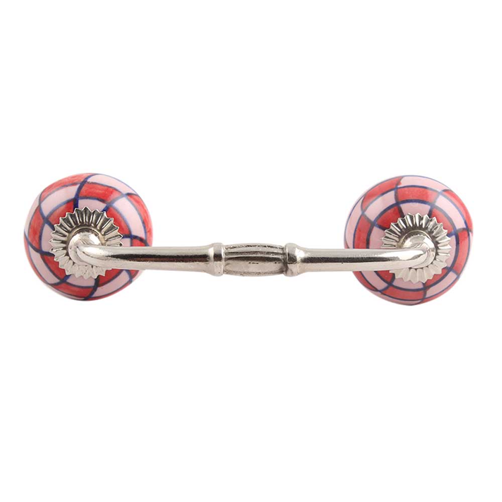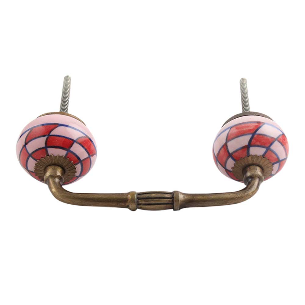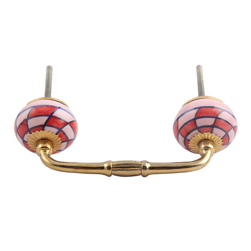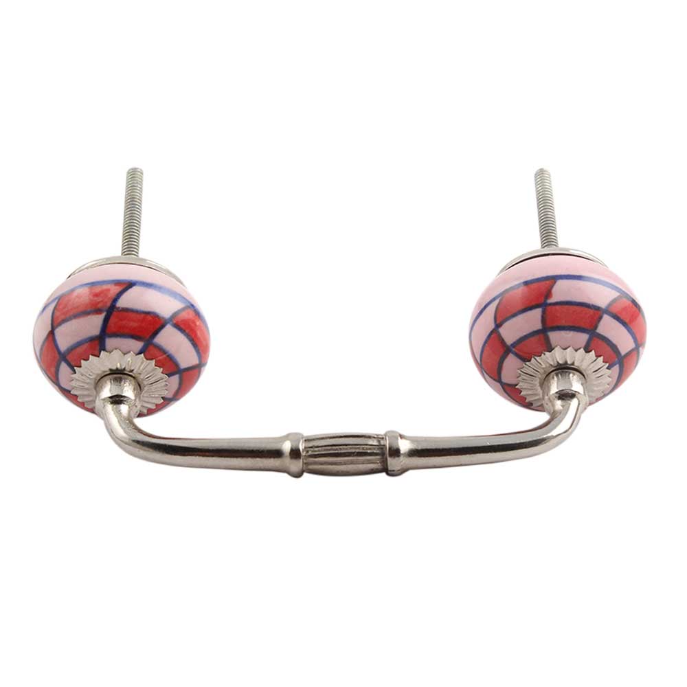 Pink Red Check Ceramic Bridge Handle. Ideal for Drawer, Dresser, Cabinet, Wardrobe, Cupboard and Almirah.