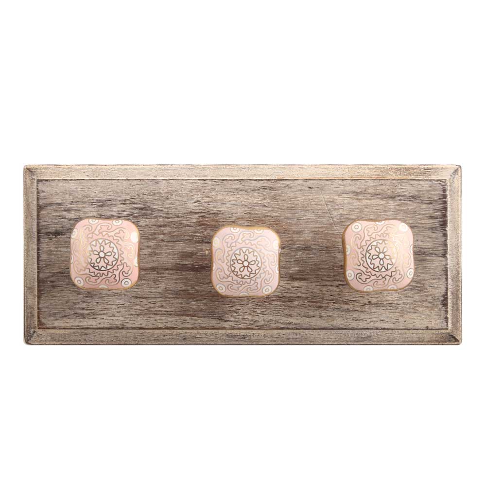 Pink Square Ceramic Wooden Hook. A Perfect Complement to the Soft Tone of the Wood are these White Traditional Hat and Coat Hook Made of Genuine Porcelain and Brass. It can be used to Hang Jewelry, Leashes, Towels, Scarves, Light Weight Sweaters, Caps etc.