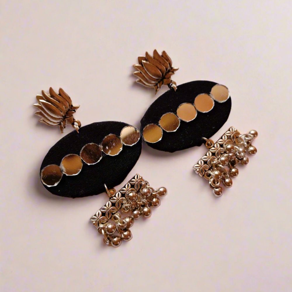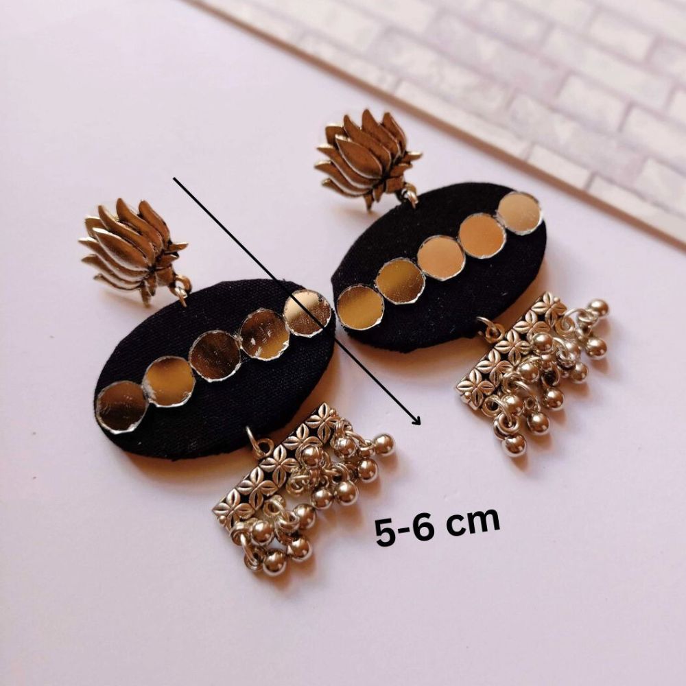 The Plain Black Mirror and Silver Ghungroo Earrings are designed for bold expression rooted in traditional Indian detailing. Crafted on a fabric base, the deep black surface creates a dramatic contrast against silver-toned mirror accents that catch light beautifully. Finished with ghungroo elements, the earrings come alive with gentle movement and sound. Balanced in size and weight, they deliver strong visual impact while remaining comfortable to wear.