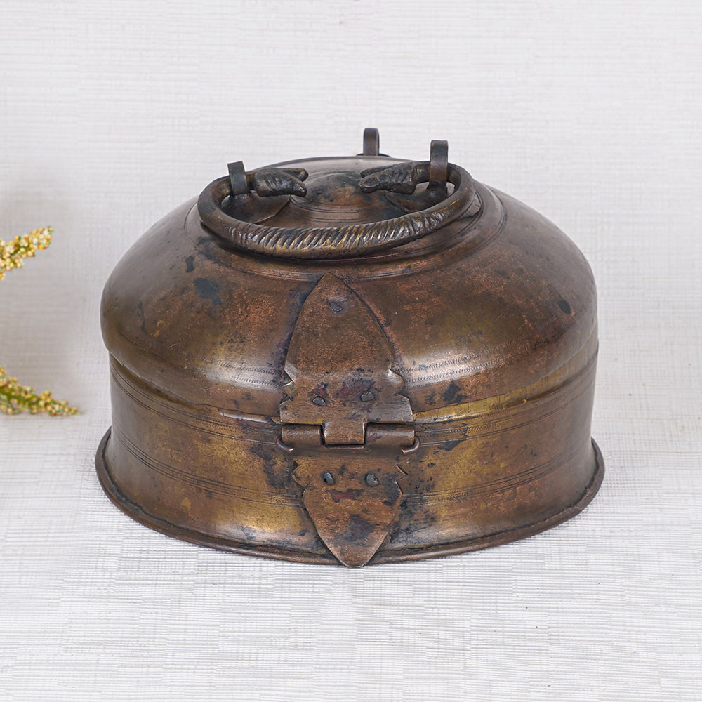 This handmade brass round jewelry box, crafted by skilled Indian artisans, is a true masterpiece. Its elegant and minimalist design, coupled with a captivating brown finish, ensures that it stands out as a luxurious jewelry box. The box is not only a practical storage solution for your precious stones and jewelry, but also a stunning decorative piece for your home or office. Featuring a convenient handle on the top, this small jewelry box is easy to carry and move around. Its antique finish exudes a sense of timeless beauty, further enhancing its allure. The box is secured with a latch, providing a secure storage space for your valuable belongings. This exceptional jewelry box is versatile and can be displayed in museums or exhibitions to attract discerning customers. It is also an ideal gift for your loved ones on special or festive occasions, reflecting your taste and thoughtfulness. With its luxurious appeal and impeccable craftsmanship, this brass round jewelry box is a true treasure.