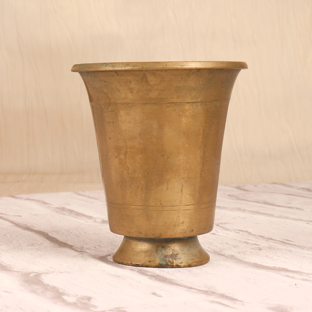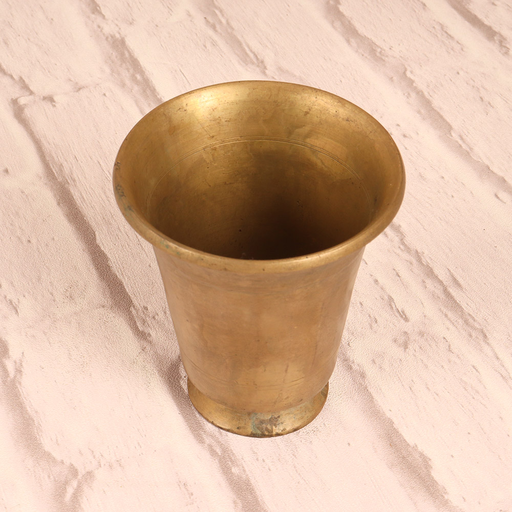 Bring the ancient traditions of South India into your modern home with this exquisite vintage brass holy water cup. Masterfully crafted from premium brass, this cup's simple yet elegant design makes it a beautiful addition to your altar, meditation space, or ritual area. The smooth, plain brown finish blends seamlessly with any decor, from rustic to contemporary. And with its solid brass construction, this cup is built to last, becoming a treasured heirloom to be passed down through the generations. Elevate your daily rituals and honor the sacred traditions of South India with this stunning vintage brass holy water cup. Its timeless beauty and functional design make it an essential tool for any spiritual seeker, yogi, or devotee looking to deepen their practice.