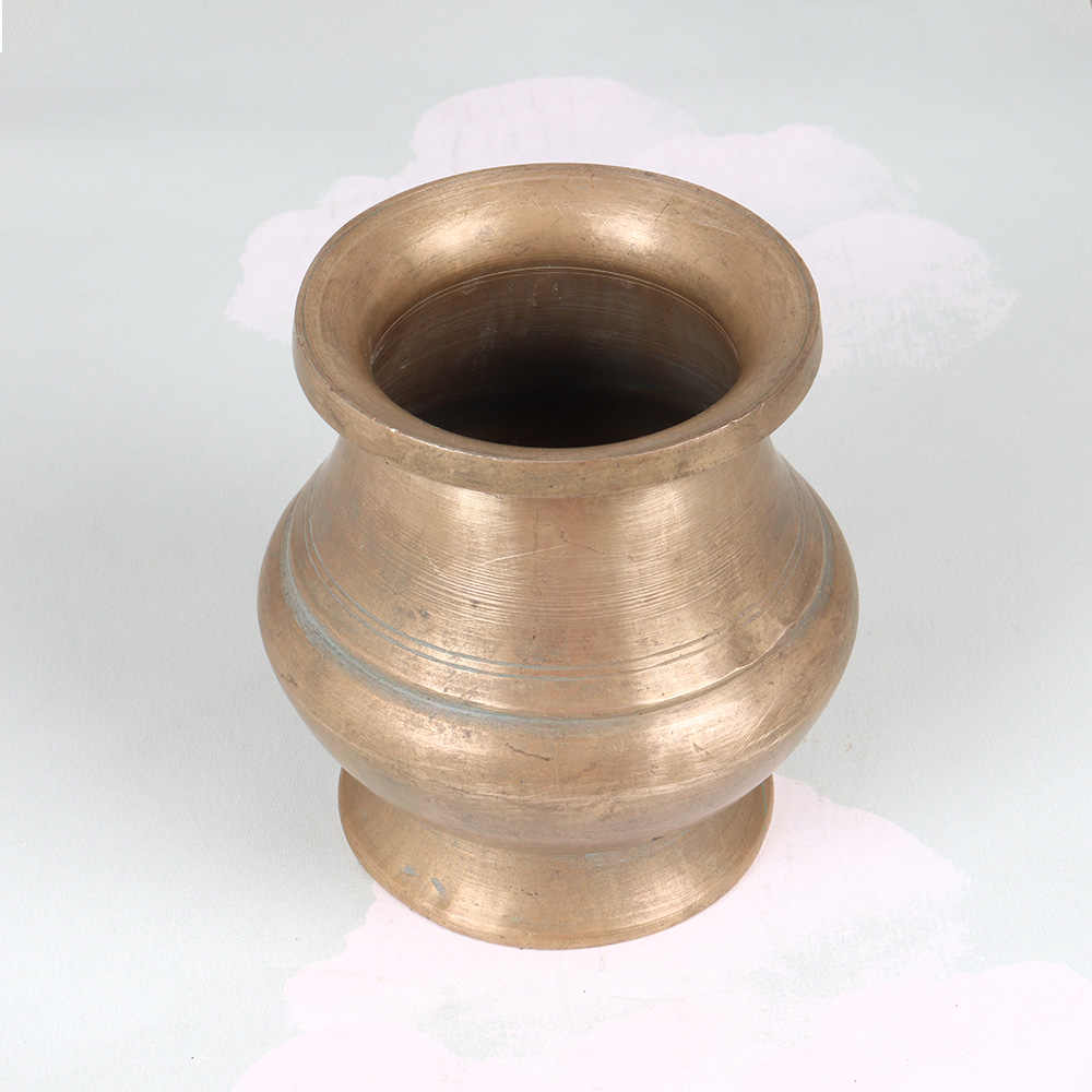 Step into the captivating world of South Indian art and bring the enchanting allure of centuries-old craftsmanship into your home with our exquisite vintage brass holy water pot. Meticulously crafted by skilled artisans, this stunning piece is a testament to the region's rich cultural heritage and enduring artistic traditions. Featuring a solid brass construction and a plain brown finish, this holy water pot emanates a timeless, understated elegance that will seamlessly blend into a variety of decor styles. Use it as a striking vase to showcase your favorite blooms, transforming it into a captivating floral display. Or, embrace its traditional purpose and fill it with holy water, imbuing your space with a sense of spiritual serenity and cultural significance. Whether you're a collector of fine art, a lover of all things vintage, or simply seeking to add a touch of exotic charm to your home, our vintage brass holy water pot is the perfect choice. Invest in a piece that not only beautifies your surroundings but also tells a story of centuries-old craftsmanship and cultural richness. Elevate your space with the allure of South Indian artistry, and let this stunning brass pot become a cherished addition to your home.