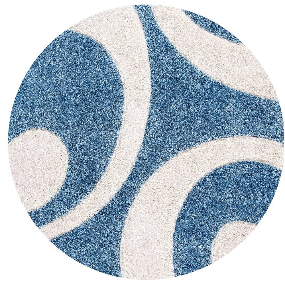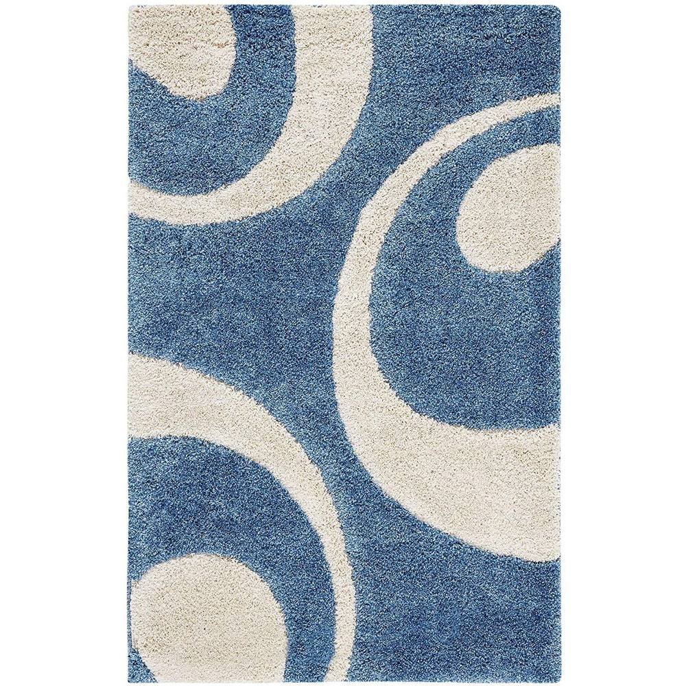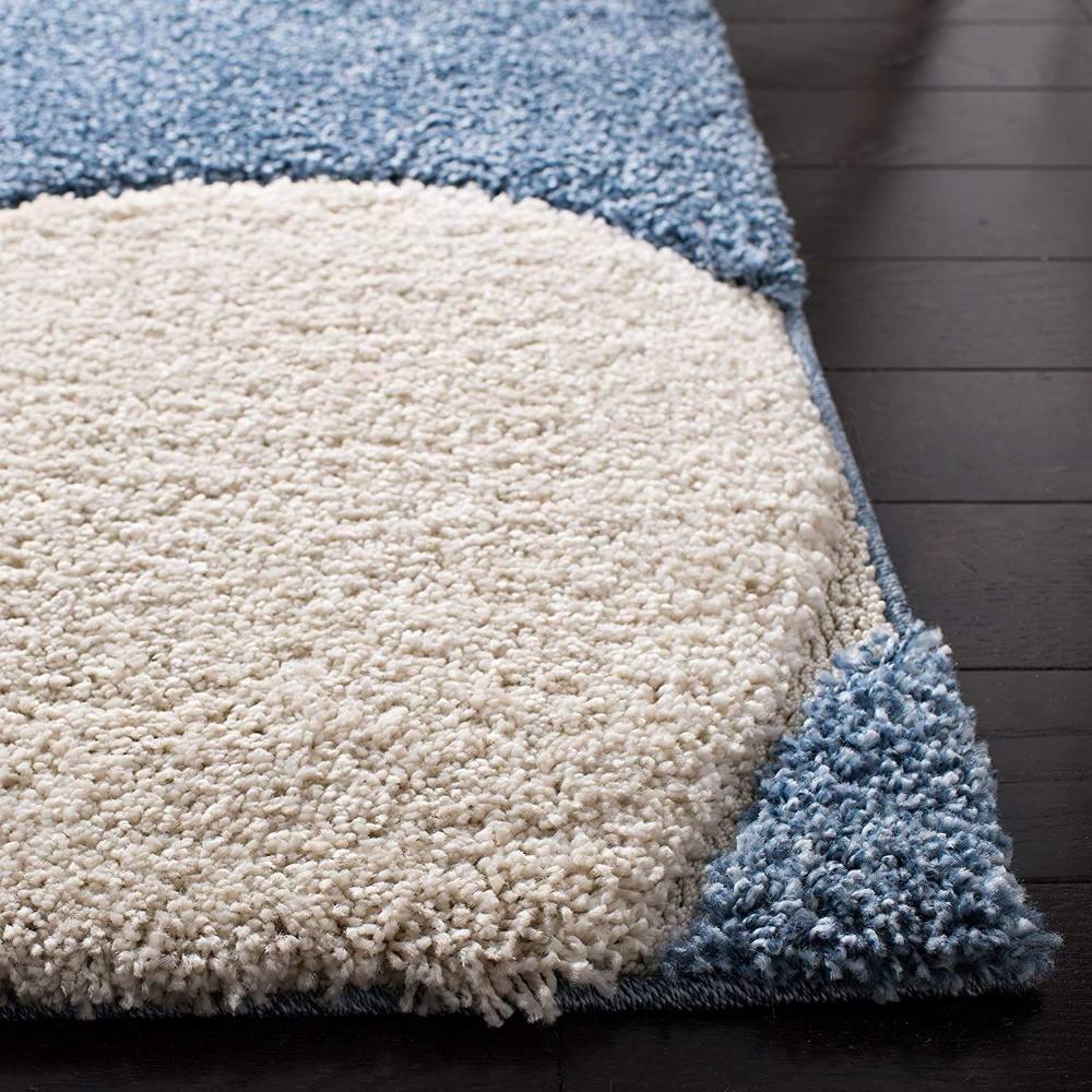 Vacuum regularly to maintain plush texture. Clean spills quickly with mild detergent and cold water. Avoid direct sunlight to preserve the color balance of blue and ivory tones.