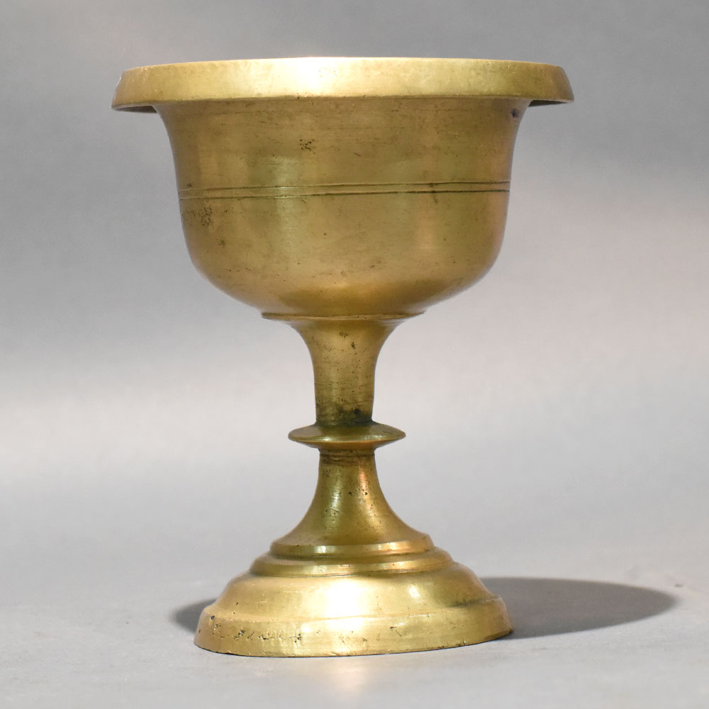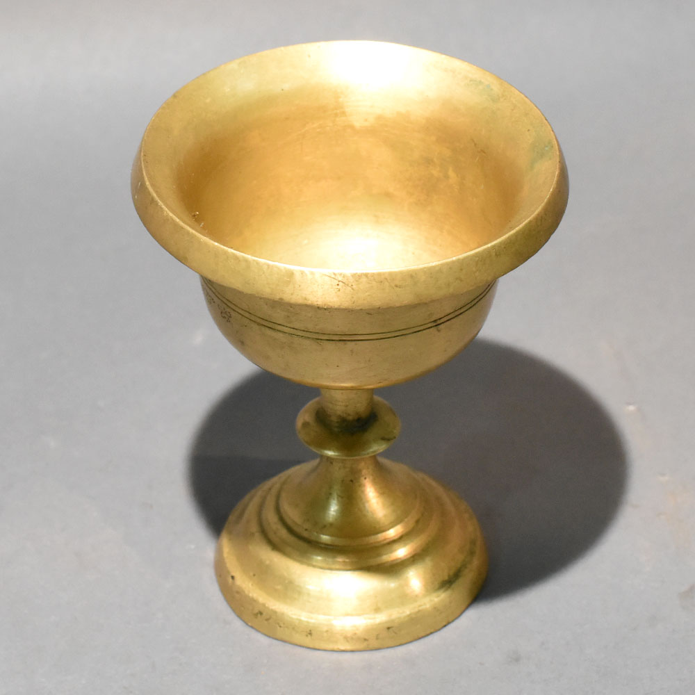 This traditional brass pedestal kalash bowl is a classic ritual vessel used in Hindu pooja ceremonies, temple offerings, and sacred rituals. The piece features a wide rounded bowl with a flared rim, supported by an elegant pedestal base that gives it a balanced and graceful temple inspired form. Kalash style vessels hold deep spiritual importance in Hindu traditions and are commonly used to hold holy water, flowers, prasad, kumkum, rice, or ritual offerings during worship. The elevated pedestal design allows the bowl to be placed prominently on pooja thalis, temple platforms, or altar spaces. The vessel showcases a smooth brass surface with minimal engraved detailing, emphasizing its timeless ceremonial appearance. The wide rim allows easy placement of offerings, while the sturdy pedestal base ensures stability during rituals and temple use. Made from solid brass, the bowl has a warm golden tone that highlights its traditional craftsmanship. Brass is widely used in Indian spiritual objects due to its durability and its association with purity and sacred rituals. Over time, the metal naturally develops a soft patina that enhances its antique temple aesthetic. Perfect for home temples, pooja rooms, religious ceremonies, festive rituals, and spiritual decor, this brass kalash bowl is both a functional ritual vessel and a decorative traditional artifact. It also works beautifully as a heritage accent in traditional interiors or devotional spaces. Each piece may show slight variations in finish, reflecting its handcrafted nature.