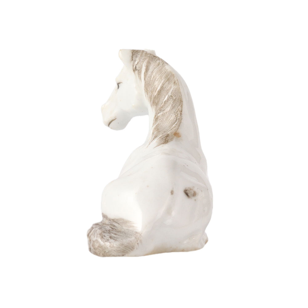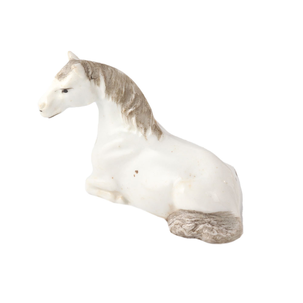 Sweet statue of a foal or young horse made of solid brass. It has a cute appearance with large ears, eyes, and a mane with texture. Its legs are long and thin. It is dozing off. With the exception of the black detailing on the mane and tail, it is all-white. You can decorate with it. a wonderful present for equestrians.