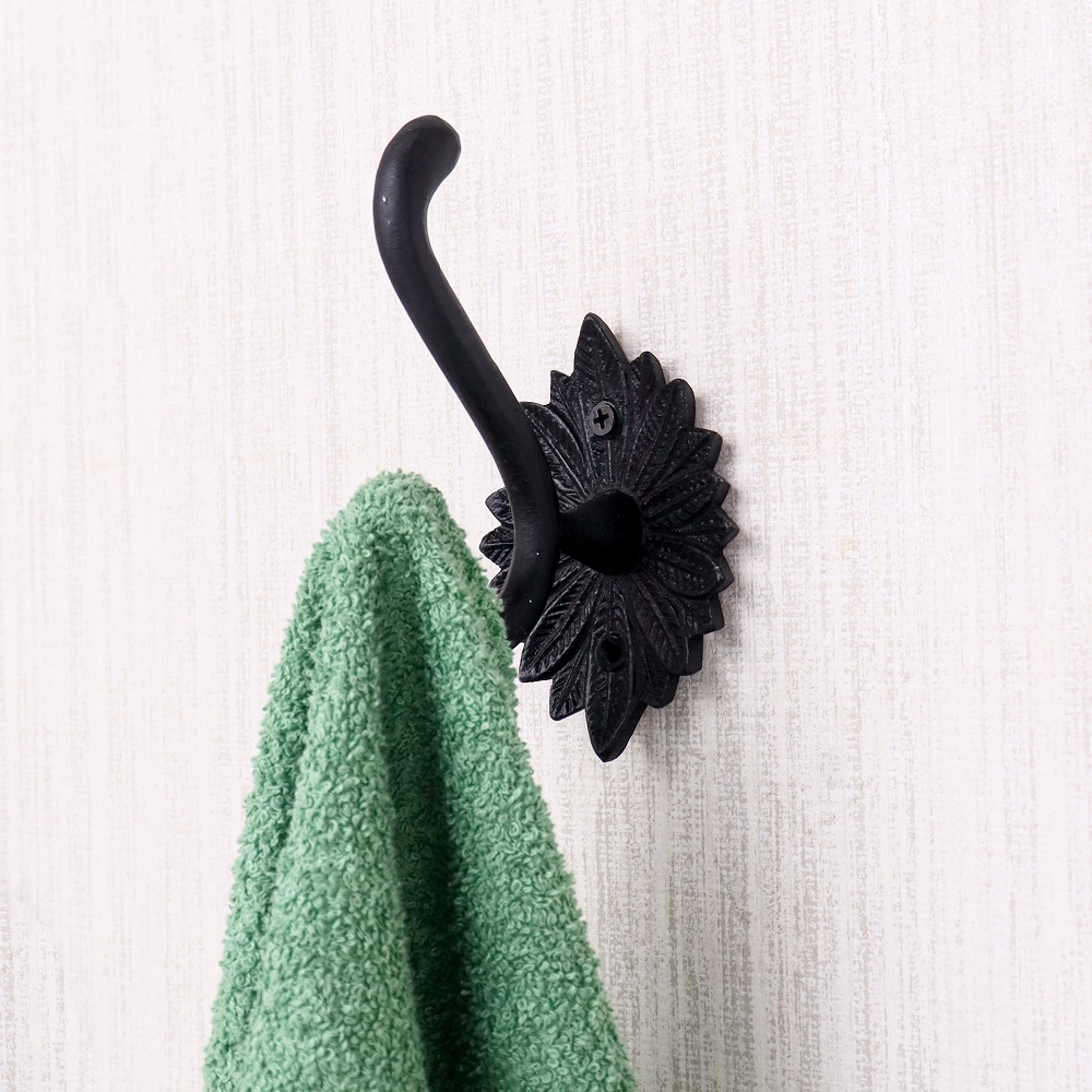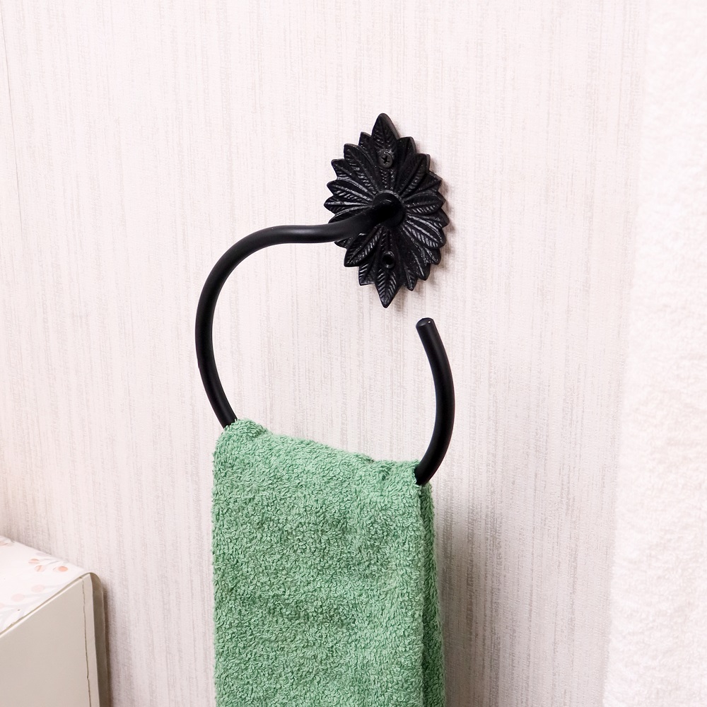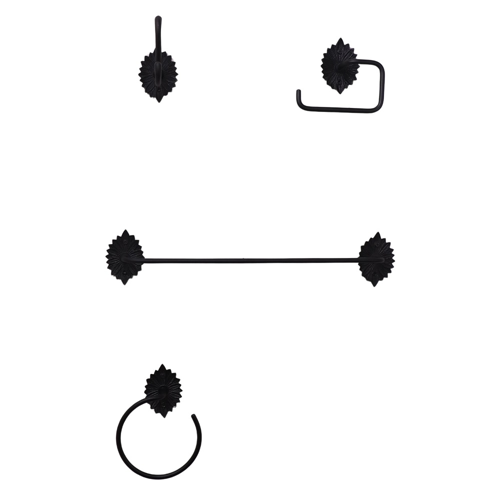 Enhance your bathroom décor with this elegant black aluminum accessory set of 4, crafted for both durability and style. Featuring a beautifully detailed floral backplate, this vintage-inspired set includes a towel bar, hand towel ring, toilet paper holder, and a versatile wall hook. Made from high-quality aluminum with a matte black finish, each piece is lightweight, rust-resistant, and designed to withstand daily use. Perfect for adding a touch of sophistication to both traditional and modern bathrooms, this coordinated set keeps your space neat, functional, and aesthetically pleasing.