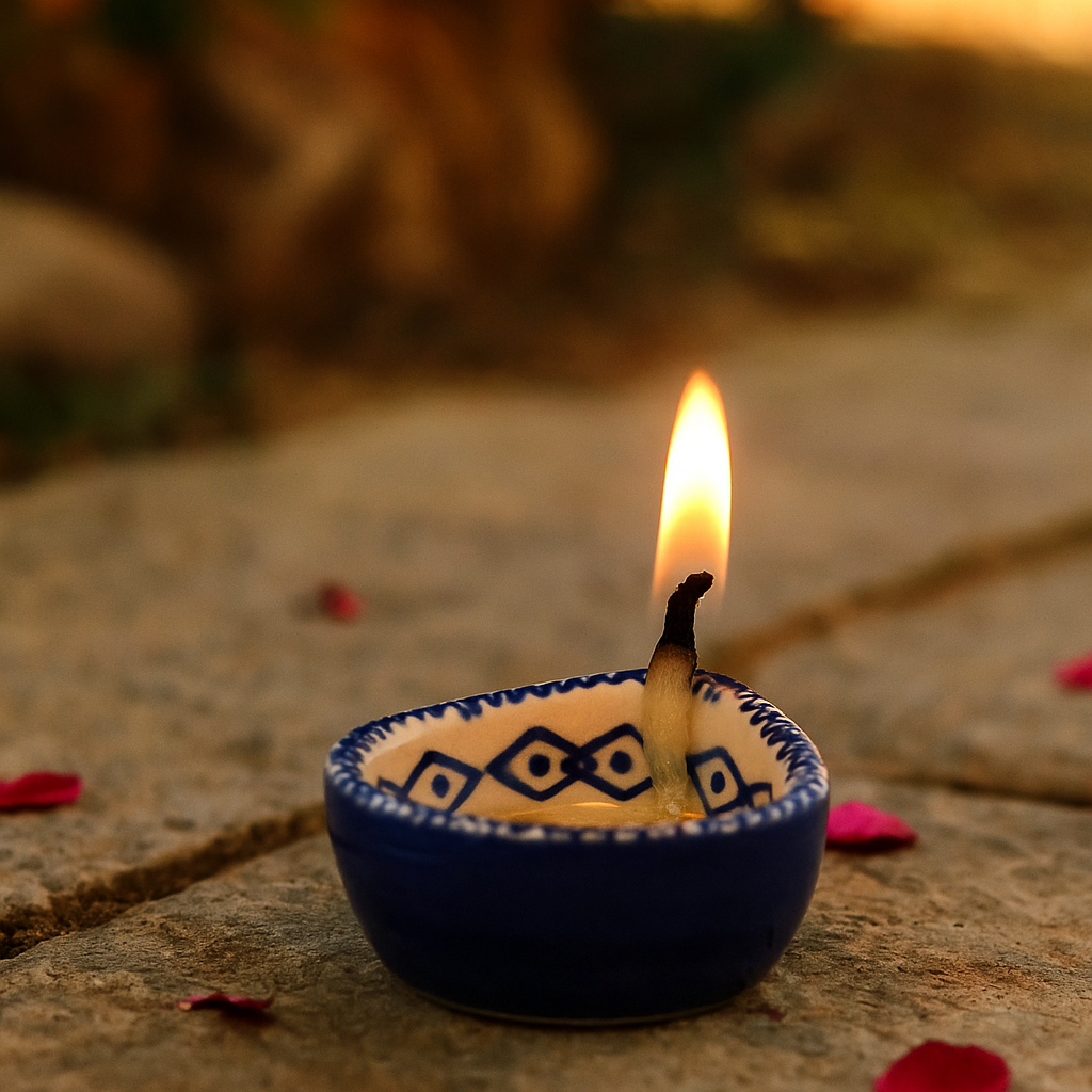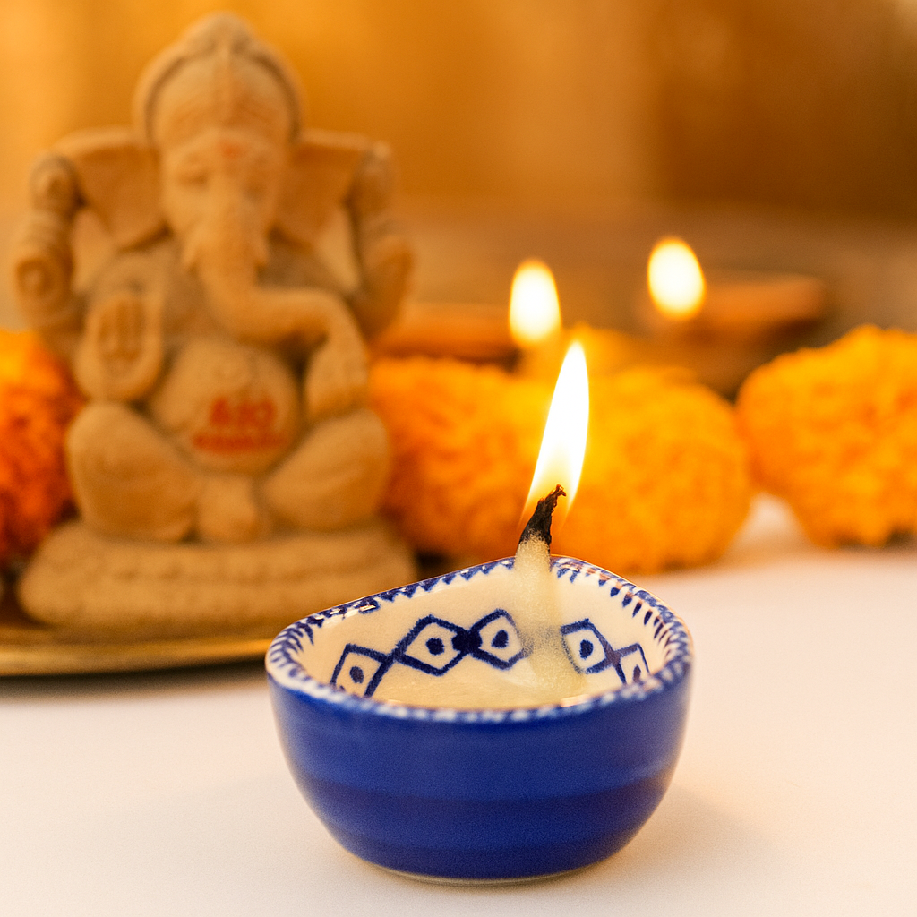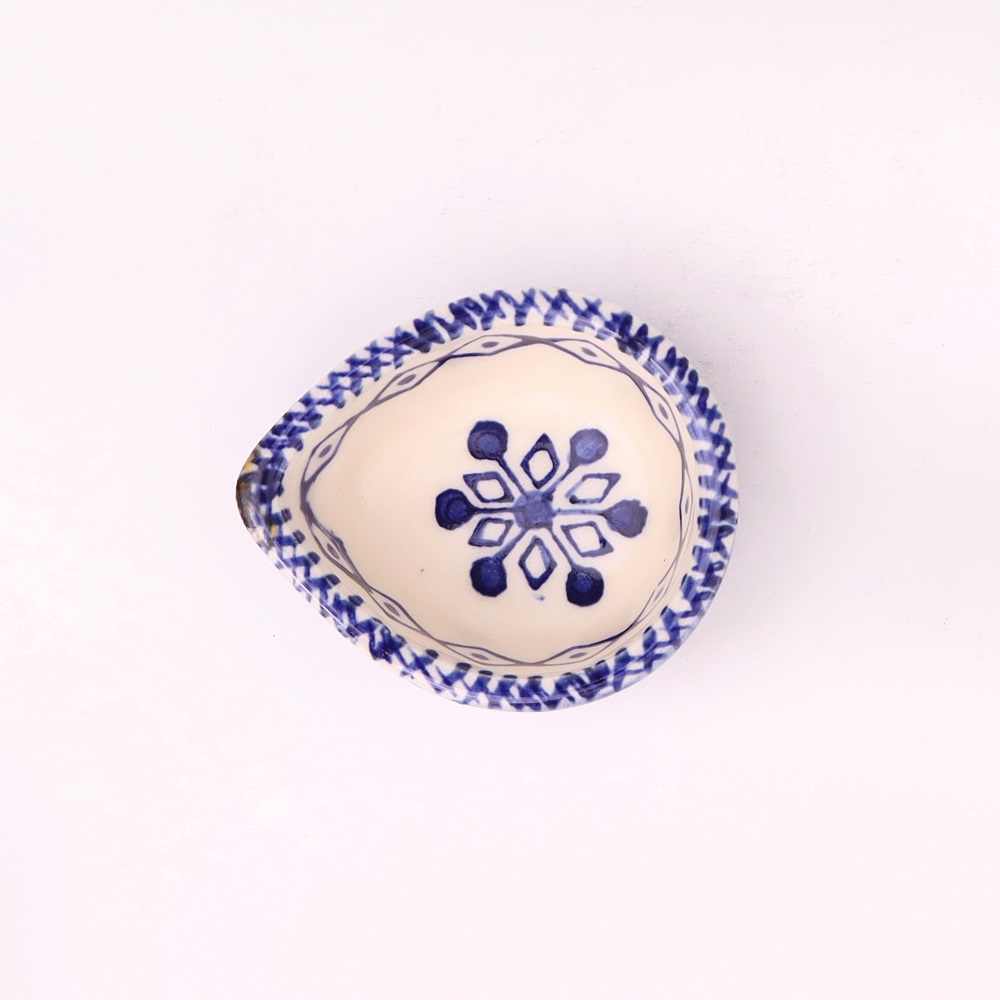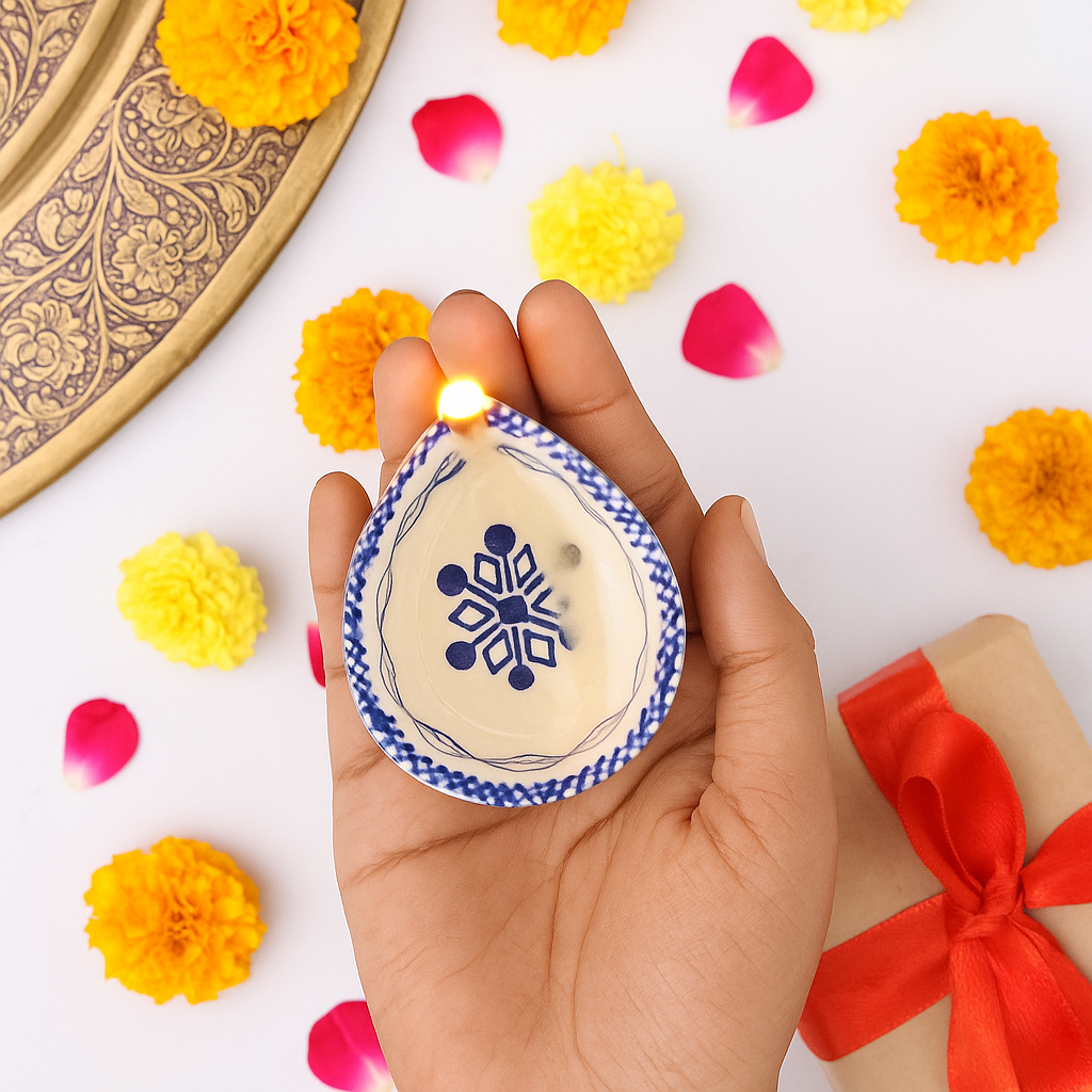 Elevate your festive rituals with this premium blue and white ceramic Diwali diya, a handcrafted masterpiece designed for temple decoration and sacred spaces. Featuring delicate hand-painted floral motifs in indigo blue against a white ceramic base, this diya reflects both tradition and timeless artistry. Compact yet striking, it offers a warm spiritual glow while serving as a decorative accent for modern and traditional homes alike. Designed by artisans who specialize in ceramic craft, this diya brings devotion and elegance into harmony.
