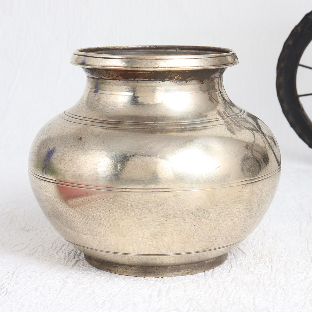 Enhance your interior decor with the timeless elegance of this vintage brass holy water pot adorned with a stunning shiny silver finish. Handmade with precision and passion by talented Indian artisans, this piece is a masterpiece of South Indian Artistry. Crafted from high-quality brass, this versatile pot is a work of art that transcends boundaries. It seamlessly fits into various settings, enhancing the ambiance of your home, office, restaurant, hotel, cafe, or shop. Its versatility knows no bounds, serving as both a decorative flower pot and a symbol of spiritual sanctity during havan, prayer, and temple rituals. This brass holy water pot is more than just an ornament, it's a piece of history and heritage. Whether you're an avid collector or an art enthusiast, this pot is an excellent addition to your vintage collection or an intriguing exhibit piece. Furthermore, this pot makes for an exceptional gift on special, festive, or auspicious occasions. Its rich history and exquisite craftsmanship make it a meaningful gesture to your loved ones, symbolizing blessings, culture, and tradition.