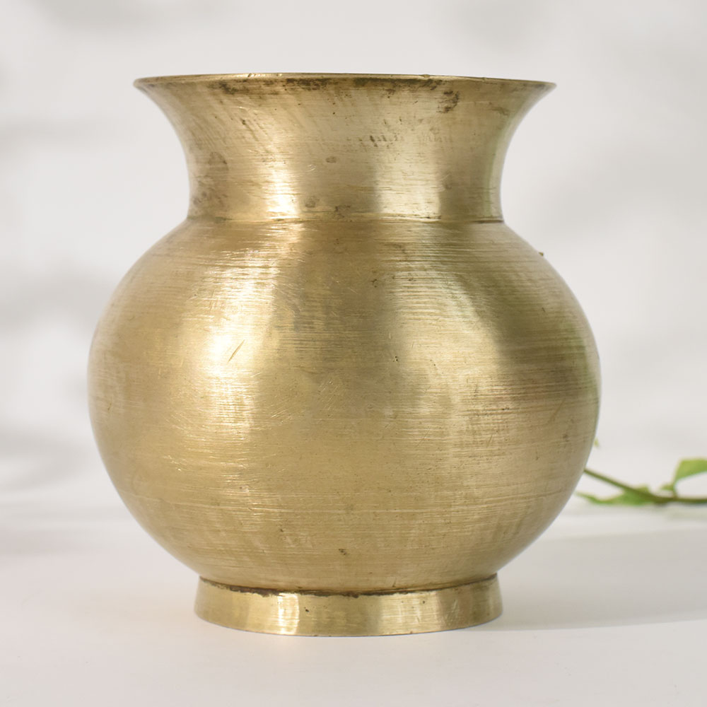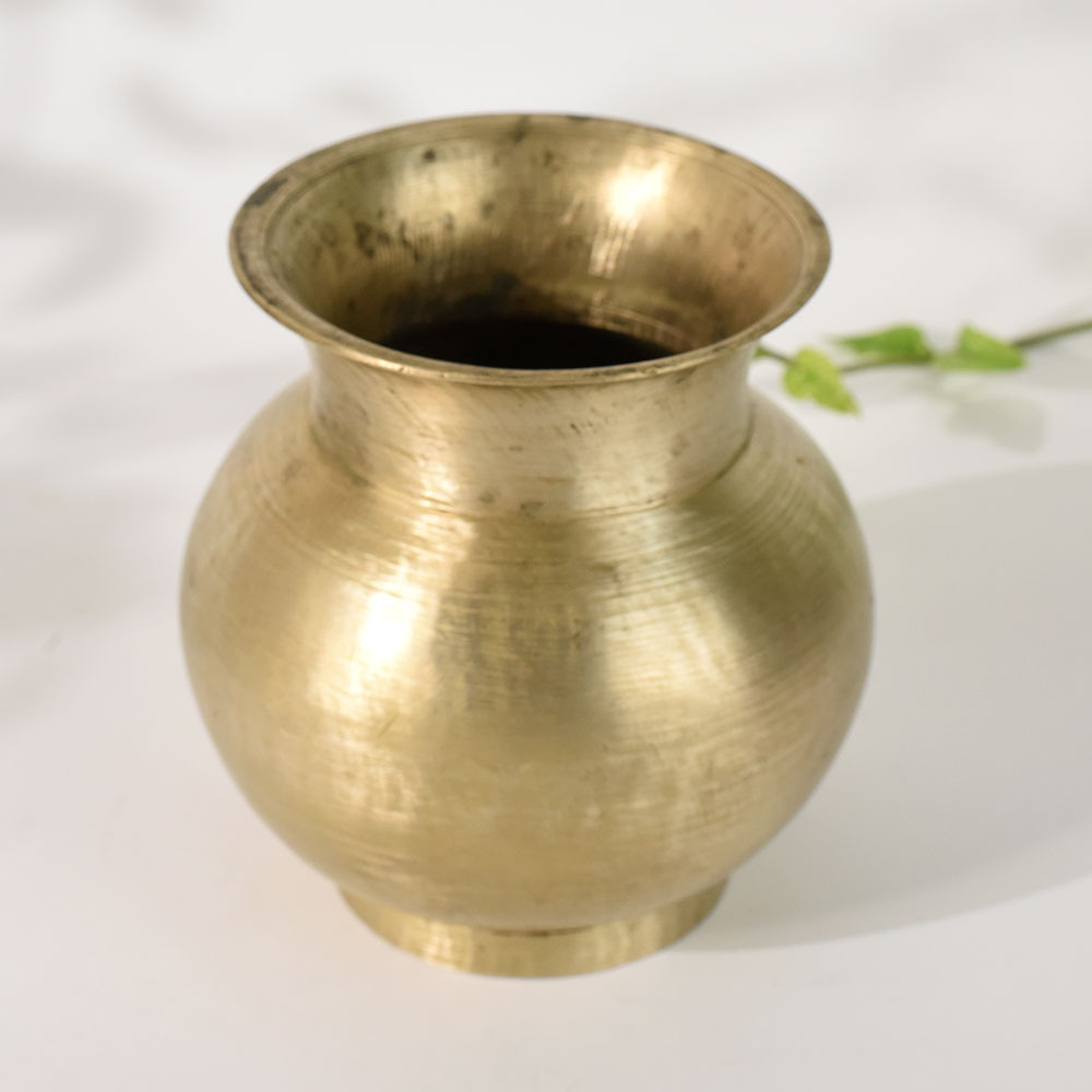 This vintage brass holy water pot is a beautifully handcrafted piece of South Indian heritage, traditionally used in temples and households for storing and offering sacred water during poojas and rituals. Made by skilled artisans using age-old metalworking methods, the pot features a smooth rounded body and a gently flared rim, giving it a distinctive silhouette rooted in classical South Indian design. The natural patina adds depth, character, and authenticity, making it both a functional ritual item and a charming collectible. Perfect for spiritual practices, traditional dcor settings, or as a meaningful heritage gift, this handmade brass pot brings cultural warmth and a sense of devotion to any space. Its timeless appeal makes it ideal for display in meditation corners, altar setups, ethnic home dcor, or antique-themed interiors.