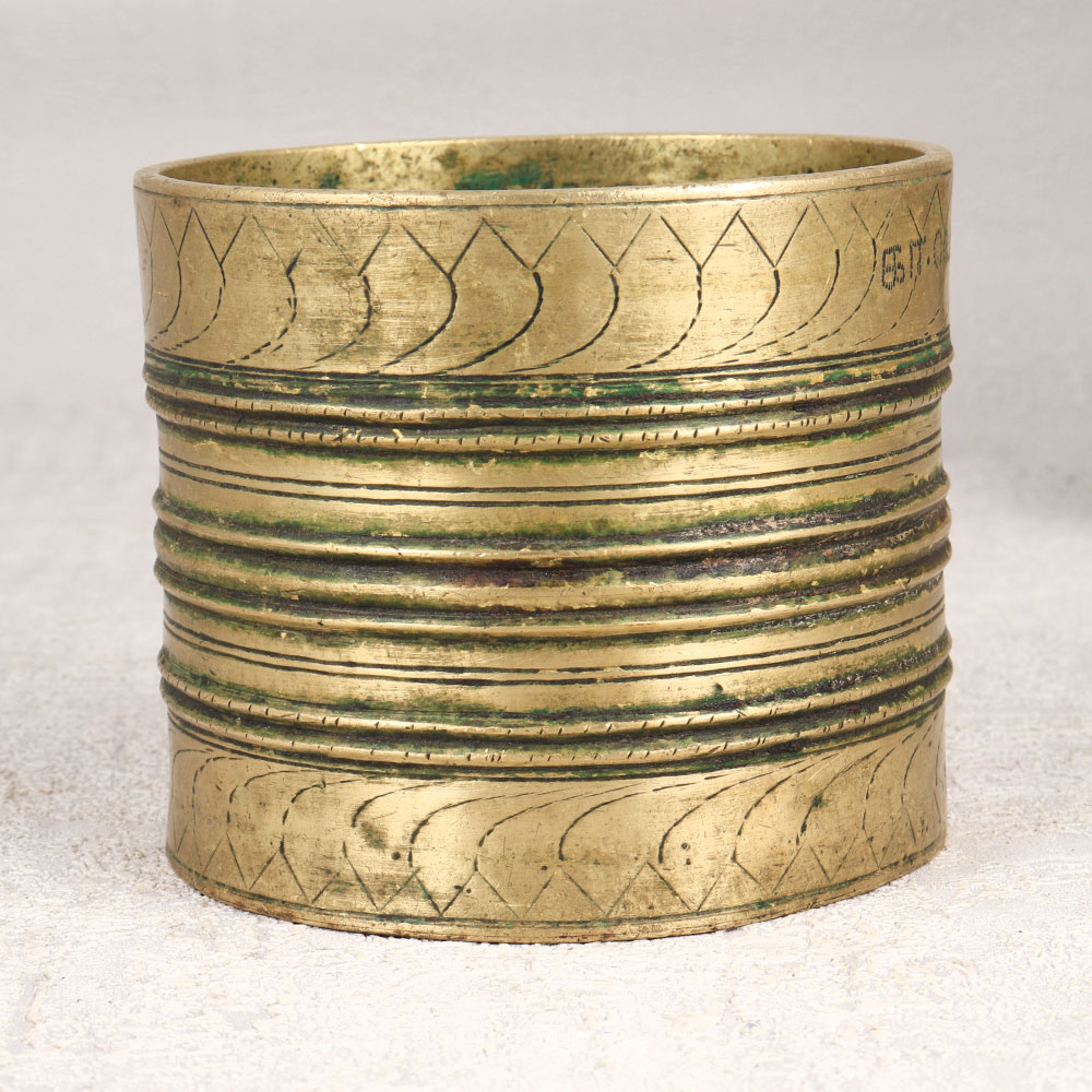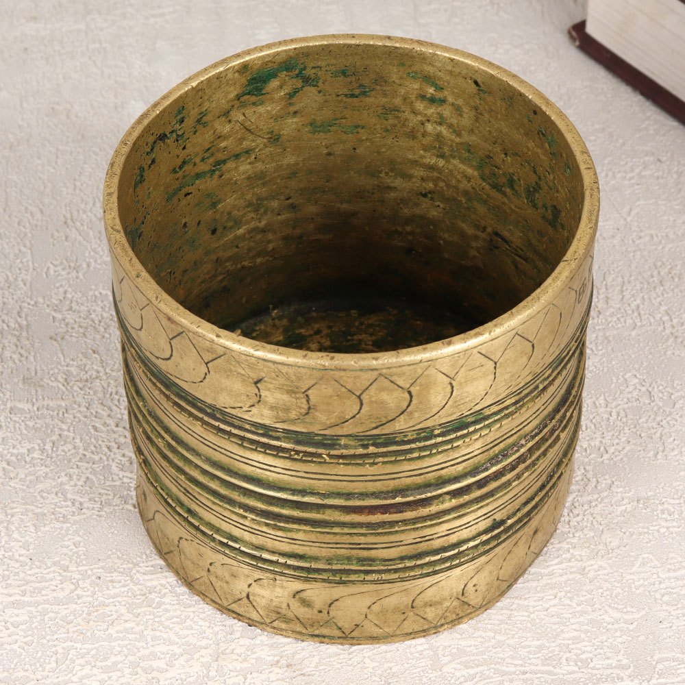 A Vintage Brass Measurement Bowl which is a timeless piece that transcends eras and cultures. Crafted with precision by highly skilled and experienced Indian craftsmen in the intricate South Indian Art style, this bowl is not merely a functional kitchen item but a piece of history and art. Made from high-quality brass, the bowl boasts an antique brown finish that adds a touch of nostalgia to any space. Its engraved detailing showcases the craftsmanship of artisans who have meticulously preserved traditional techniques. Originally used for measuring rice and dal in the culinary pursuits of generations past, it now finds a new purpose as a stunning indoor flower pot. This versatile bowl seamlessly transitions between the realms of the kitchen, home, office, restaurant, hotel, or cafe. Its unique design and antique allure make it a captivating addition to any vintage collection, and it serves as a thoughtful and meaningful gift for your family, friends or relatives on special, festive, or auspicious occasions.