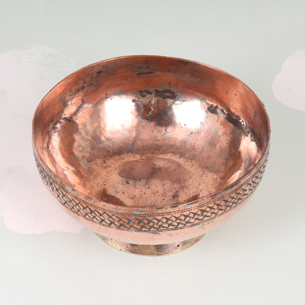 Prepare to be enchanted by the captivating beauty of this vintage copper Islamic bowl, a masterpiece of Peshawari art. Crafted with unparalleled skill and attention to detail, this exquisite piece is a true testament to the rich cultural heritage of the region, blending intricate designs with the warm, inviting glow of copper. Immerse yourself in the vibrant world of Peshawari art and let this vintage copper bowl transport you to the bustling streets of Pakistan. Display it prominently in your home, and let its mesmerizing patterns and warm metallic tones captivate your guests. Whether you're a collector of fine art, a lover of global design, or simply seeking to add a touch of cultural richness to your living space, this stunning bowl is the perfect addition. Imagine the conversations and admiring glances it will spark, as friends and family marvel at the intricate details and the captivating history behind this remarkable piece. Elevate your home decor and experience the timeless beauty of Peshawari craftsmanship with this exquisite vintage copper Islamic bowl. Unlock the allure of this captivating piece and let it transform your space into a celebration of global artistry.