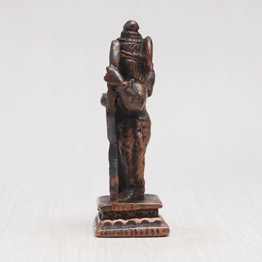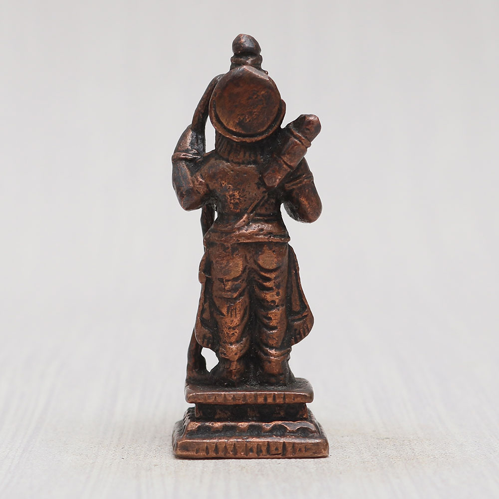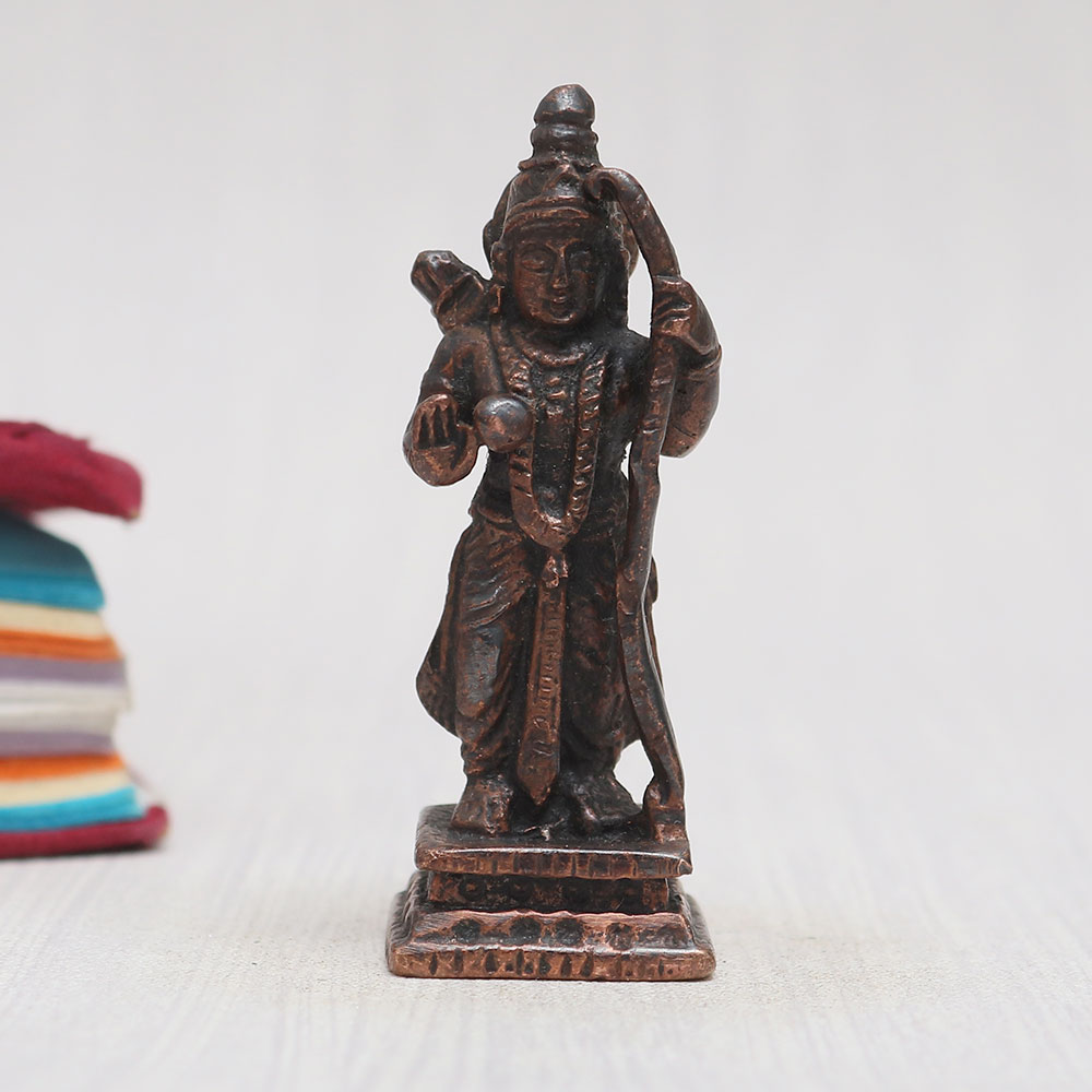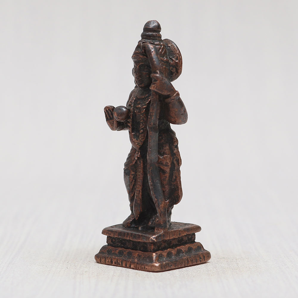 This divine copper statue of Lord Ram is a masterpiece handmade by professional Indian artisans from high-quality copper. This exquisite statue depicts Lord Ram in a majestic standing posture, with a bow gracefully held in his left hand and quivers of arrows on his back. The vintage-style finish adds an aura of timeless elegance to this Indian god sculpture. Perfect for your prayer room at home, office, restaurant, cafe, or shop, this eye-catching statue boasts intricate detailing that makes it a captivating item for exhibitions, decorations, and collections. Its spiritual significance allows it to be a cherished object for worship in temples, enhancing the divine ambiance. Additionally, this alluring murti online can be a thoughtful gift for your loved ones on special, festive, or auspicious occasions.
