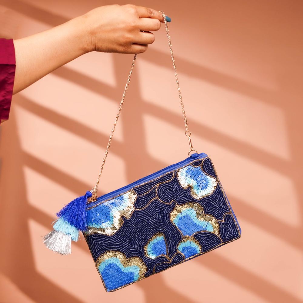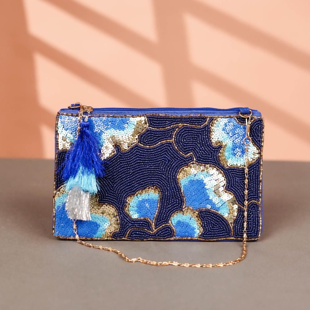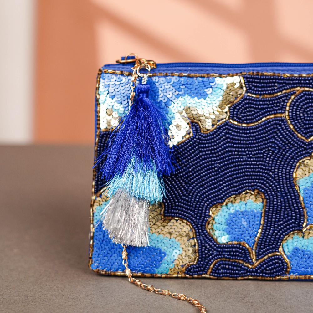 This deep blue cotton and beads handbag is an ode to refined evening elegance. Embellished with hand-beaded floral motifs in electric blue, silver, and hints of gold, the design shimmers with sophistication. The rich navy background provides a dramatic contrast, making the colors pop beautifully. A dual-tone tassel in bold blues adds a playful touch, while the delicate gold chain allows for versatile styling. Whether paired with a sleek dress or a festive ensemble, this bag brings an instant touch of glamour.