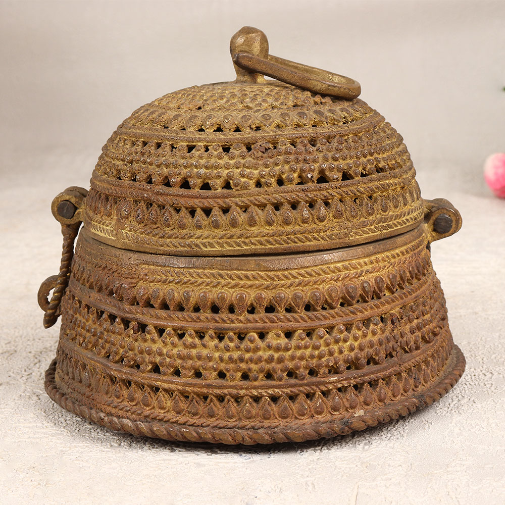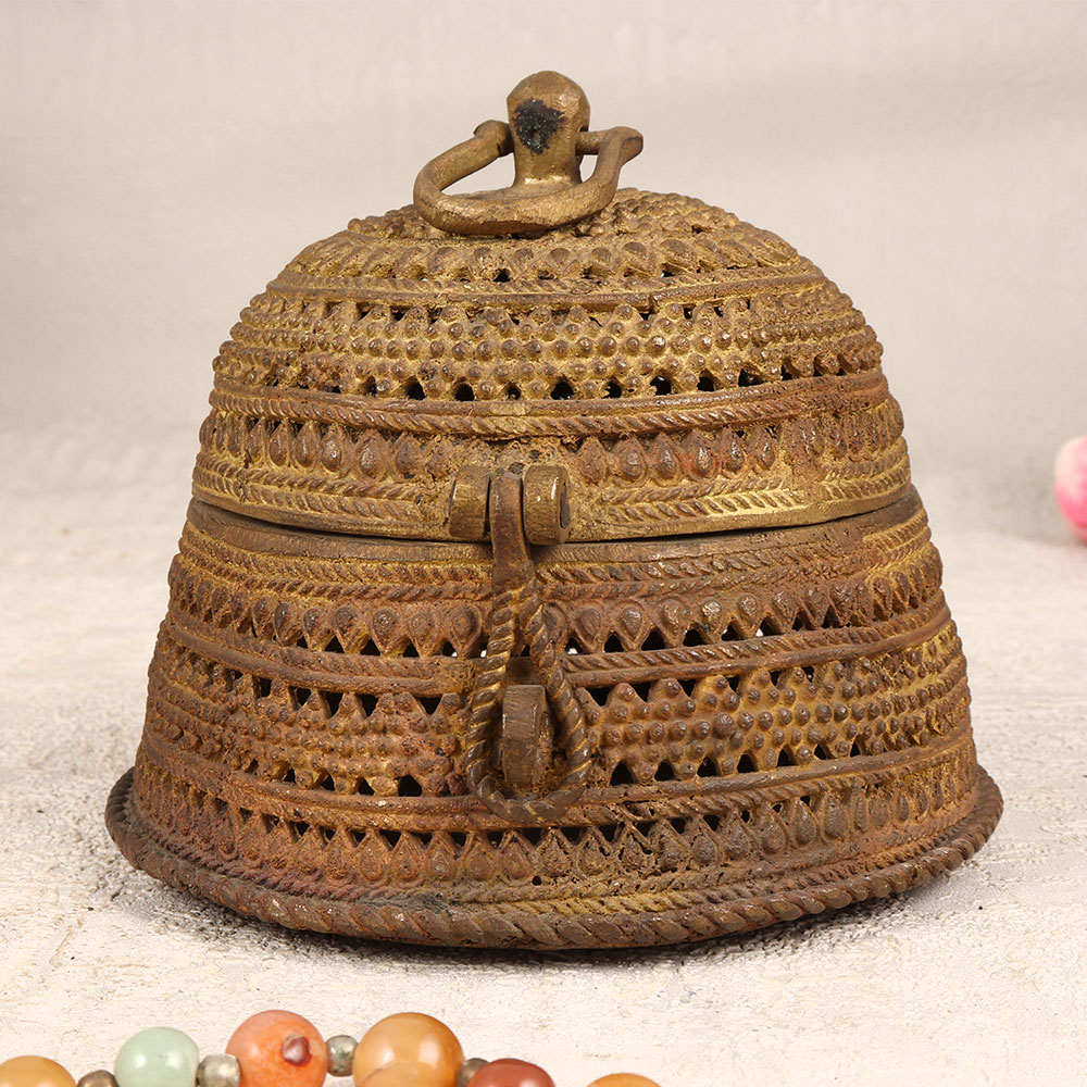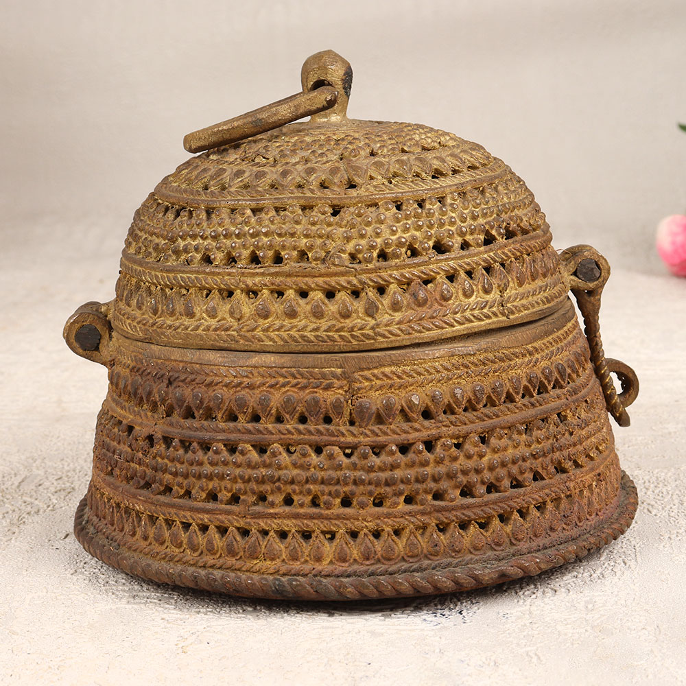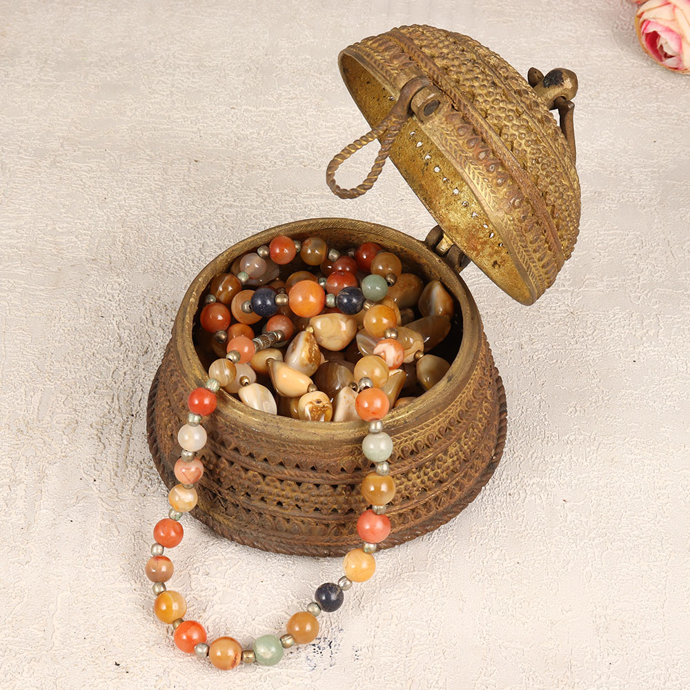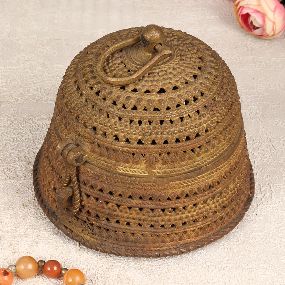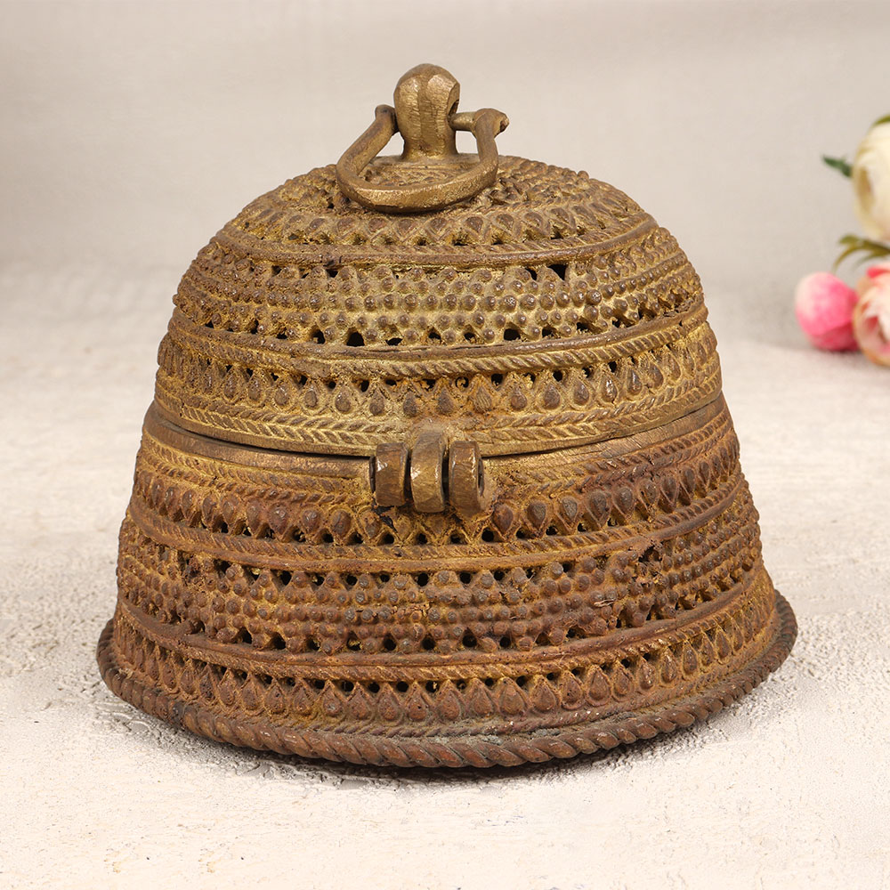 Expand your collection with our exquisite Vintage Brass Jewelry Box that is a captivating blend of artistry and functionality. Crafted in a round shape, this timeless piece boasts intricate engravings that tell a story of craftsmanship and tradition. The sturdy latch ensures the safety of your cherished possessions, making it an ideal haven for precious stones and jewelry. With its rich antique brown finish, this jewelry box exudes a classic allure, adding a touch of nostalgia to any space. Each box is a testament to the expertise of skilled Indian artisans from the culturally rich region of Odisha. Meticulously handmade using high-quality brass, it reflects the finesse of Odisha Art. Versatile in its application, this jewelry box is a stunning addition to your home, office, restaurant, hotel, or cafe, enhancing the aesthetic appeal of any environment. Embrace the allure of a bygone era by incorporating this piece into your vintage collection or surprise your loved ones with a thoughtful gift on special, festive, or auspicious occasions.