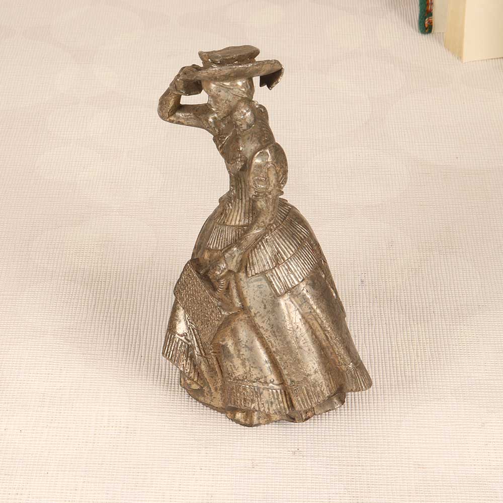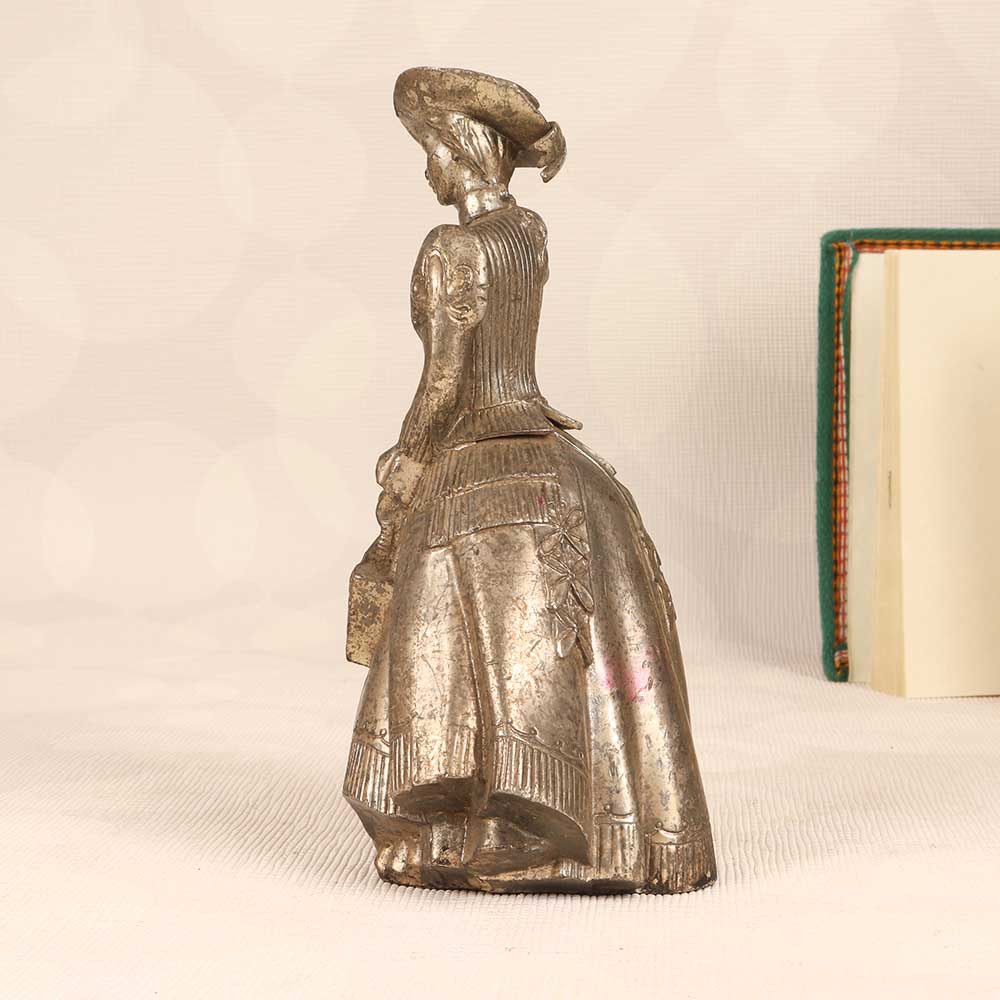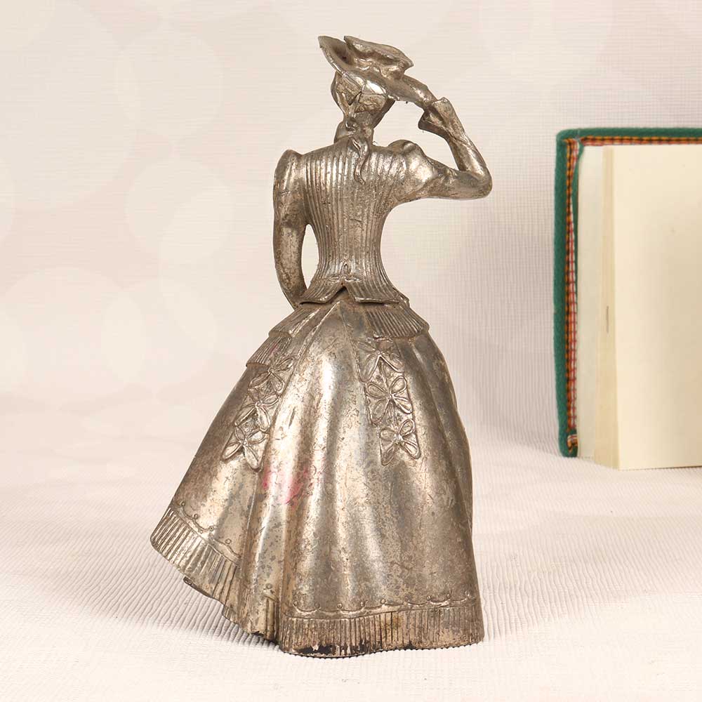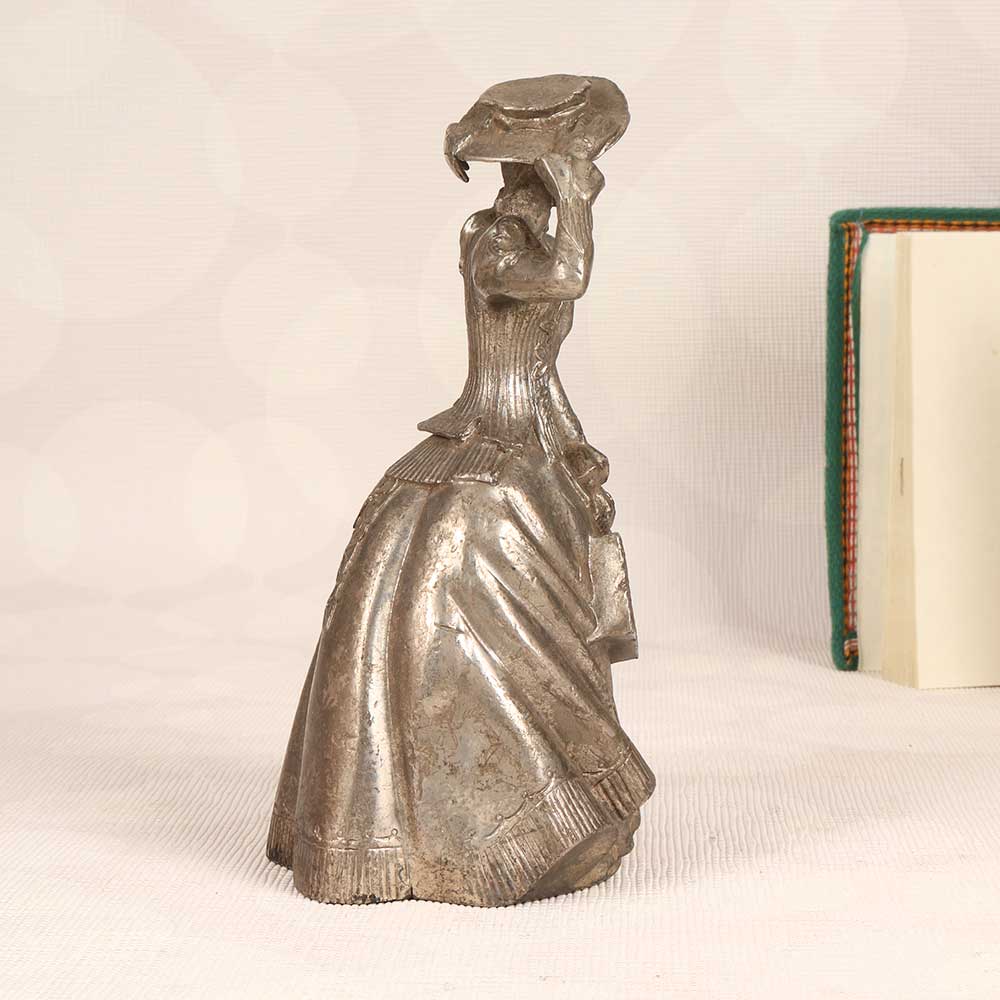 Stand out with vintage elegance! This stunning metal standing lady adds a touch of timeless grace to any space. Crafted in English Art, she features intricate details that make a bold decorative statement. Her graceful pose and silver finish give her a light, airy feel. With her flowing dress and delicate features, this metal lady brings a feminine, romantic vibe wherever she goes. Place her in an entryway or living room to greet guests with old-world charm. Her silver finish gives a cool, sleek contrast to wood furniture and warmer décor. This special accent piece is perfect for those who love vintage style. Bring the beauty of yesteryear into your home with this elegant metal standing lady statue. She’s sure to add timeless appeal to any space!