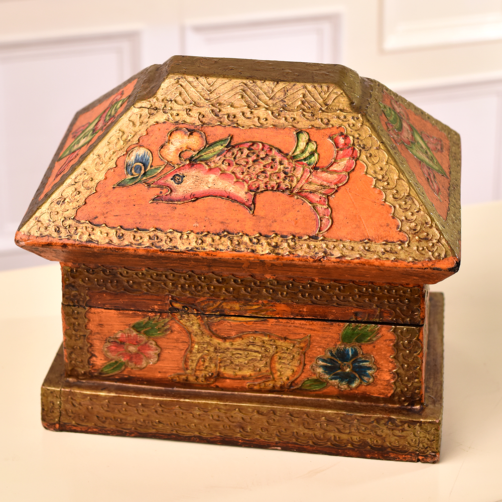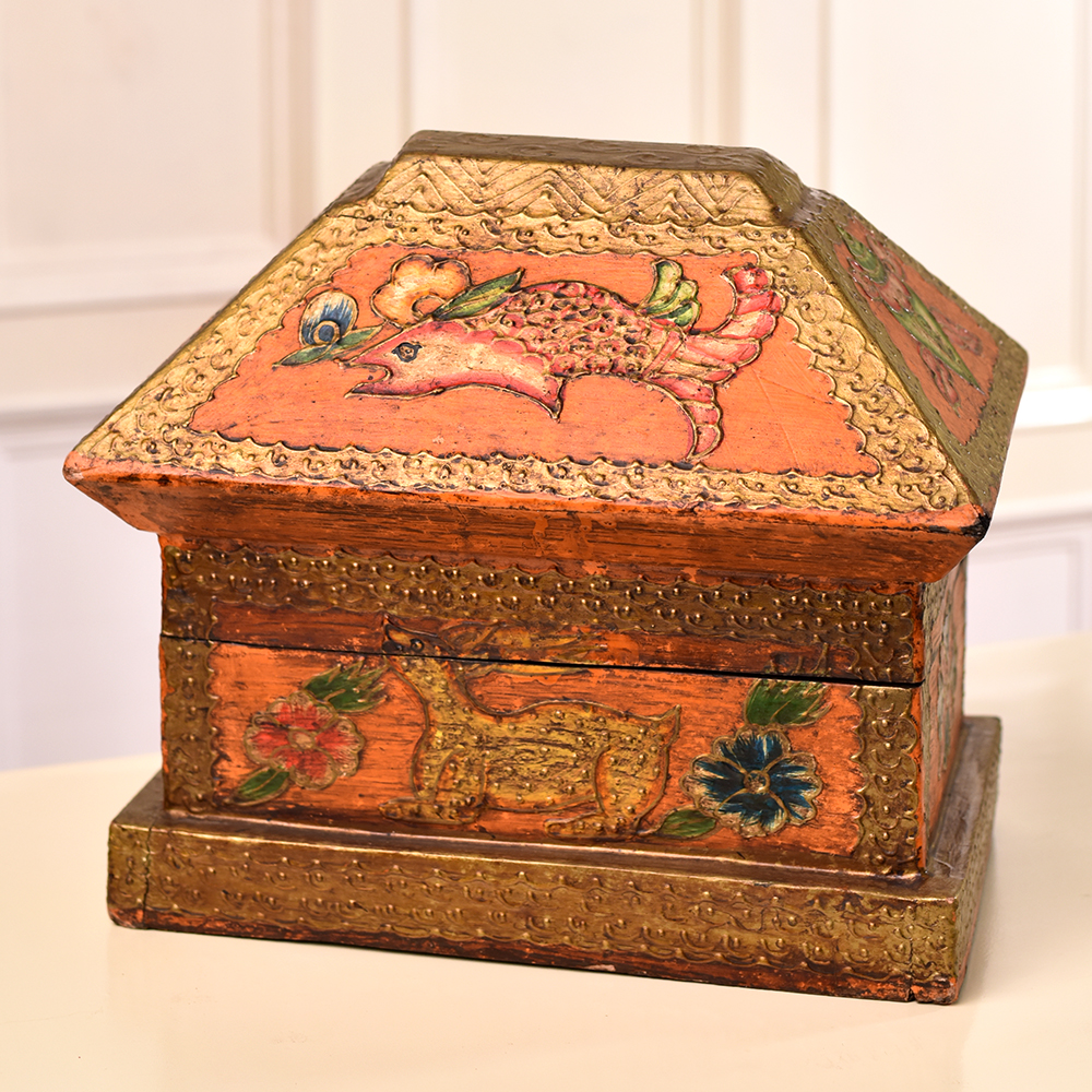 Immerse yourself in the craftsmanship of this multi-coloured wooden box which is a testament to the skill and artistry of Indian artisans. Handmade with precision and care, the box features intricate engravings of fish, animals, and floral motifs, each telling a story of tradition and heritage. Crafted from high-quality wood, this box not only serves as a stunning jewelry organizer but also as a cherished repository for small treasures. The vibrant hues dance across the surface, adding a touch of elegance to any space. Display it at exhibitions to showcase the rich tapestry of Indian craftsmanship, drawing admiration for its detailed design and meticulous execution. Beyond its visual allure, this box becomes a heartfelt gift for your family, friends or relatives on special or festive occasions - a tangible expression of your appreciation for beauty and culture.