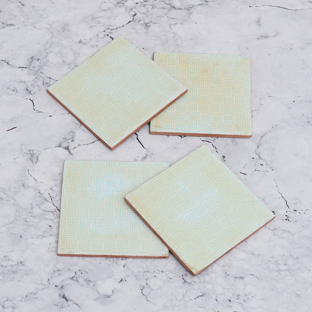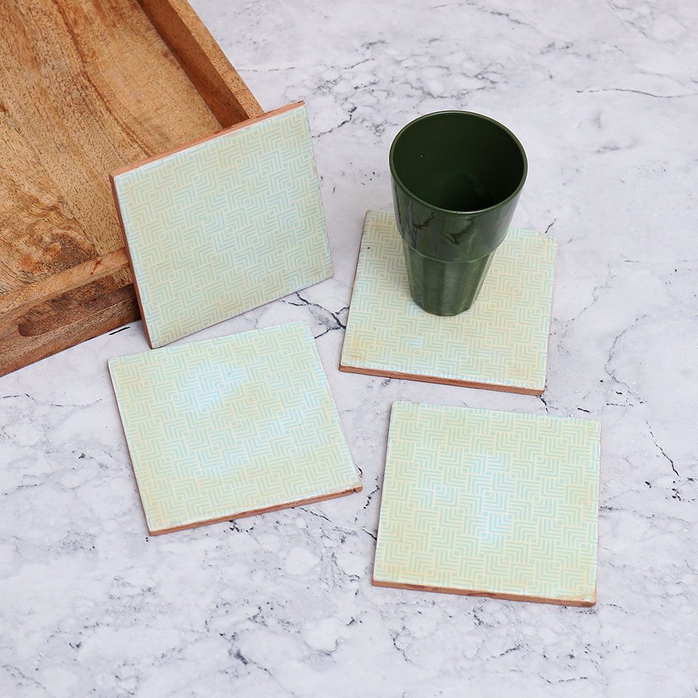 The finest set of wooden coasters you\'ll ever come across. Handmade by highly skilled Indian craftsmen, these 4 coasters are crafted from premium-quality wood. With their square shape and a soothing light blue colour, these coasters double as decorative pieces that effortlessly elevate the aesthetic of your home or office. Designed to hold water, tea, juice, or coffee glasses, these coasters are the perfect companions for any beverage. Whether you\'re enjoying a quiet evening at home, hosting guests, or working diligently in your office, these coasters will ensure that your surfaces remain free from unsightly stains. The Wooden Coaster Set is not just functional, but also makes for an exquisite gift. Surprise your loved fours on special or festive occasions with this elegant and practical present. Ideal for home use, office spaces, restaurants, hotels, or cafes, these coasters are the epitome of style and utility. Don\'t settle for anything less than the best.