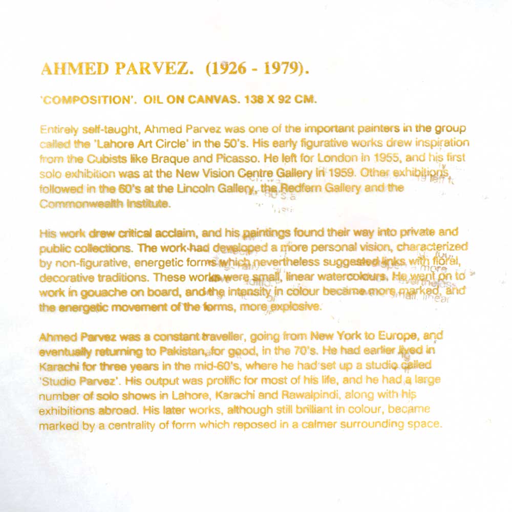 Ahmed Paervz was one of the imporrtant figures in the group called "Lahore Art Of Circle " . His work drew critical acclaim and his paintings found his way into private and public collection .The work had developed a more personal vision characterized by non-figurative ,energetic forms which nevertheless suggested links with floral decorative traditions.He went to work on work in gouache on board and the inrtensiity in color became more marked and the energetic movement of forms more explosive.