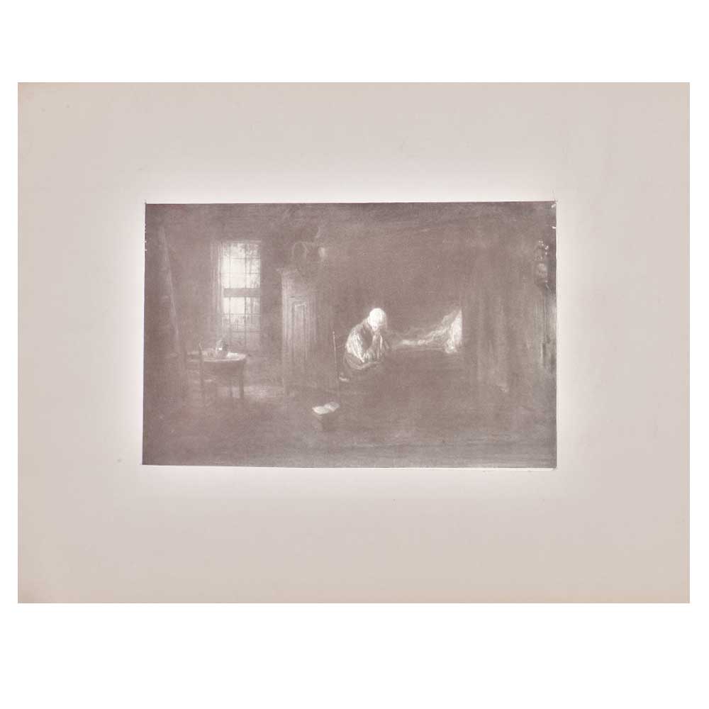 This is very dark print in which depicts the sorrow of a poor women sitting on a chair probably crying on the death of her loved one who can be seen in the background. . On the extreme corner there is a big window. Placed in one corner we can also see an old round table and chair.