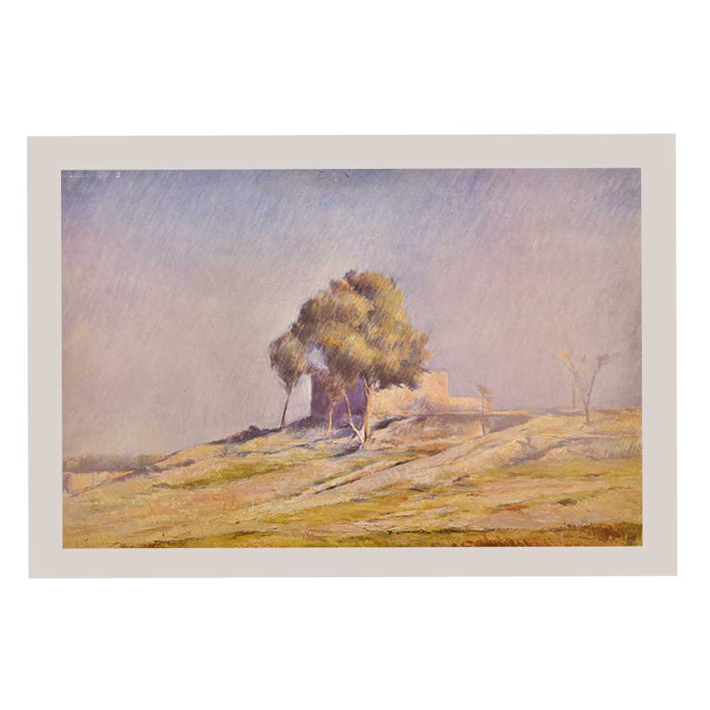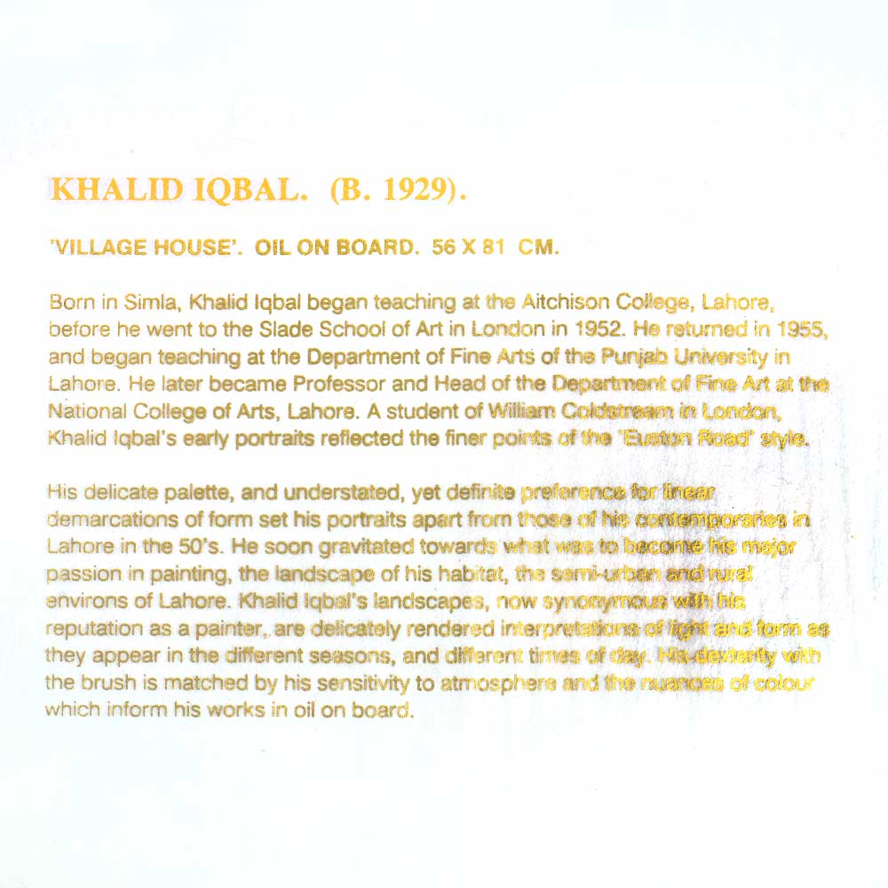 Prof Khalid Iqbal is a legend in his lifetime. He has brought realism to painting with impressionistic treatment of colour and light, thus creating a veritable atmosphere in his landscapes.Iqbal has undertaken painting in almost all seasons to depict prevailing light effects. Here and there one sees thrushes on barren land with noontime light giving a palpable sense of the heat under a hazy, dusty sky; and at time moisture-laden dark clouds over still water, between green fields, give the sensation of wetness in the air as if it has rained only moments ago.