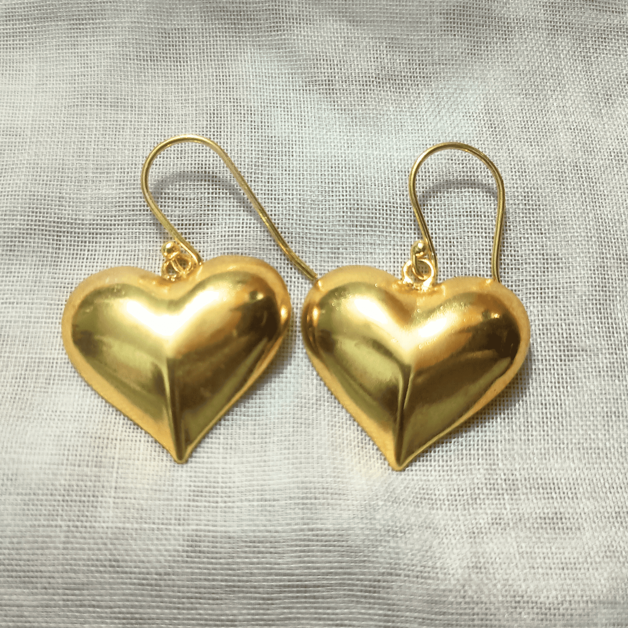 These Puffy Gold-Plated Heart Earrings bring a sculpted, romantic charm to handcrafted jewelry. Made from solid brass and finished with a rich gold plating, each heart is designed with a softly rounded, “puffy” silhouette that feels playful yet refined. The handmade detailing gives every pair subtle variations, making each piece a small work of wearable art. Lightweight, luminous, and expressive, these earrings elevate everyday dressing with gentle sophistication.