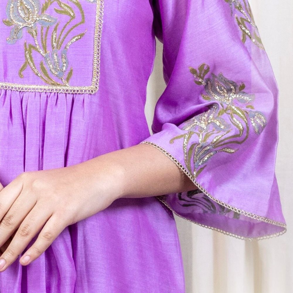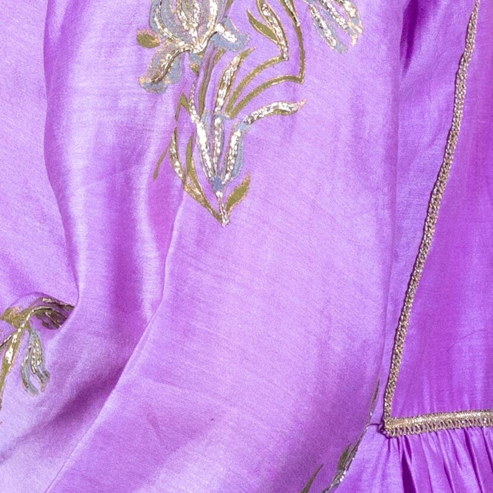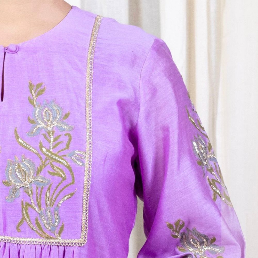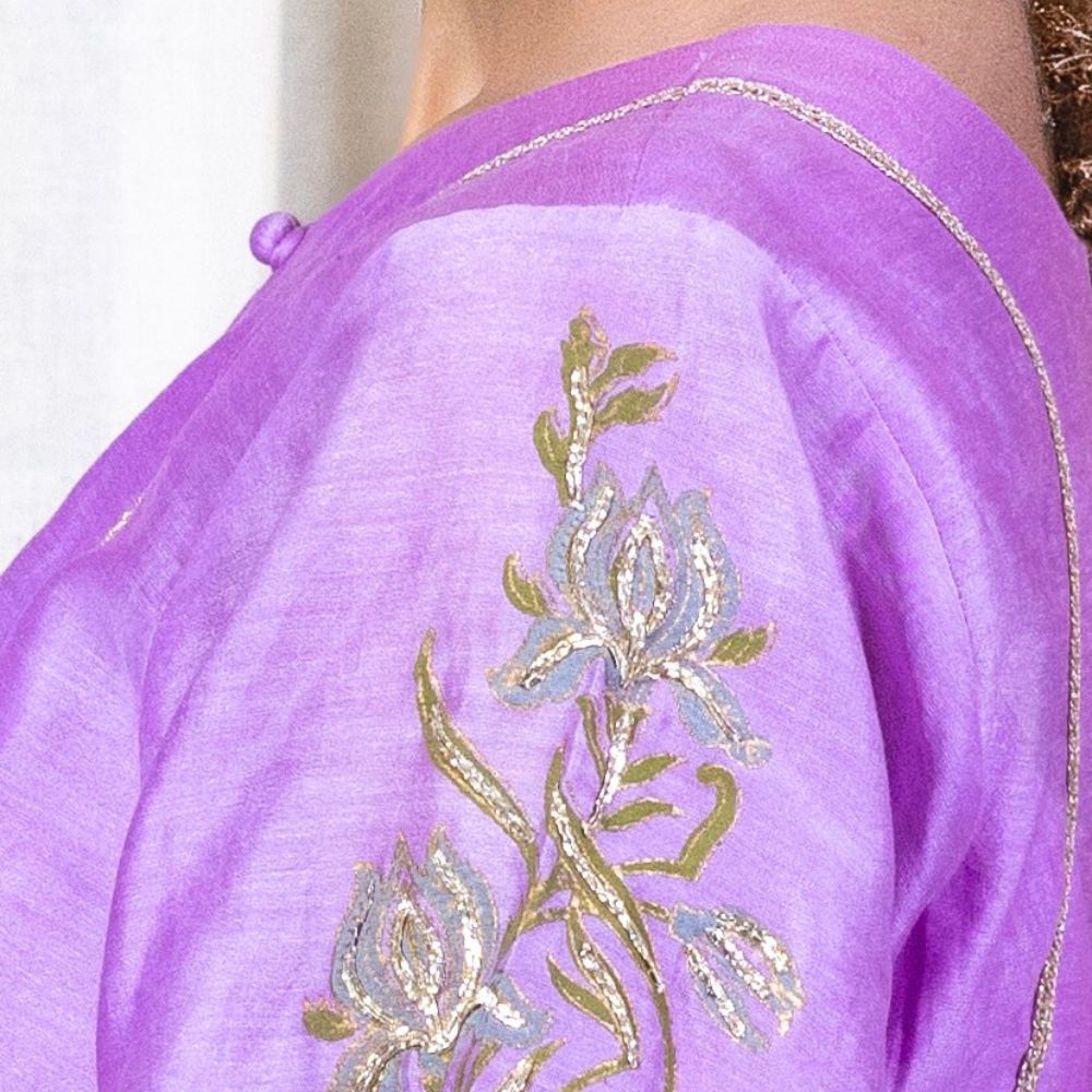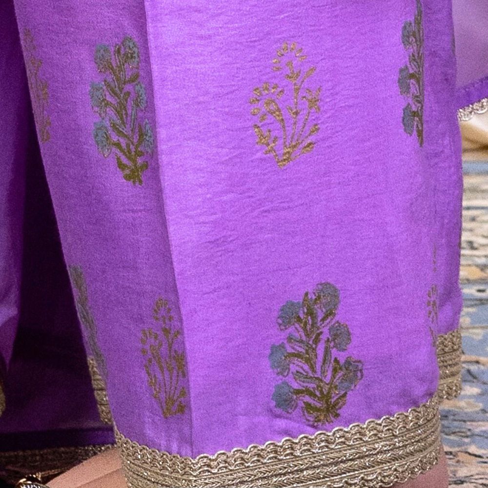 Make a bold yet graceful statement with this Purple Gathered Kurta Set, exquisitely crafted from pure cotton Chanderi and enriched with traditional hand embroidery and block prints. The kurta features a softly gathered silhouette with intricate floral embroidery on the yoke and sleeves, exuding artisanal elegance. Its vibrant purple hue adds a festive flair, making it a perfect pick for poojas, wedding functions, or celebratory gatherings. Paired with comfortable cotton silk bottoms adorned with coordinated block prints and delicate trims, the set ensures both comfort and sophistication. The look is completed with a lightweight viscose organza dupatta that drapes effortlessly, highlighted with embroidered borders to add a luxurious finish. This handcrafted ensemble beautifully fuses Indian heritage with contemporary fashion, ideal for women who seek timeless beauty and effortless style. Pair it with juttis and traditional earrings for an ensemble that speaks of refinement and festive charm.