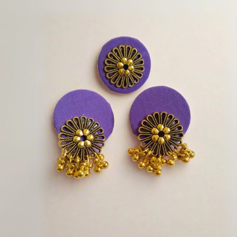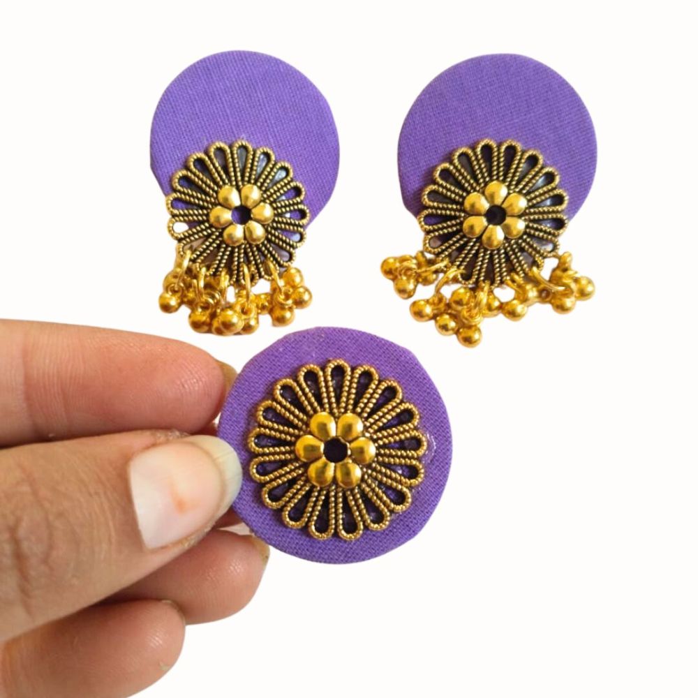 The Purple Golden Round Studs Earrings with Adjustable Ring Set is designed as a harmonious pairing that blends rich color with handcrafted charm. Crafted on a fabric base, the deep purple tone evokes royalty and depth, while golden accents add warmth and festive glow. The round stud earrings offer a balanced, statement look, complemented by a matching adjustable ring for cohesive styling. This set brings together comfort, versatility, and artisan-inspired elegance.