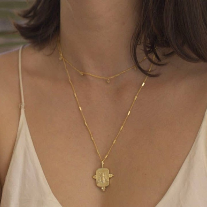 Keep the necklace dry and wipe gently after wearing to maintain the medallion’s detail and the 18K gold-plated shine.