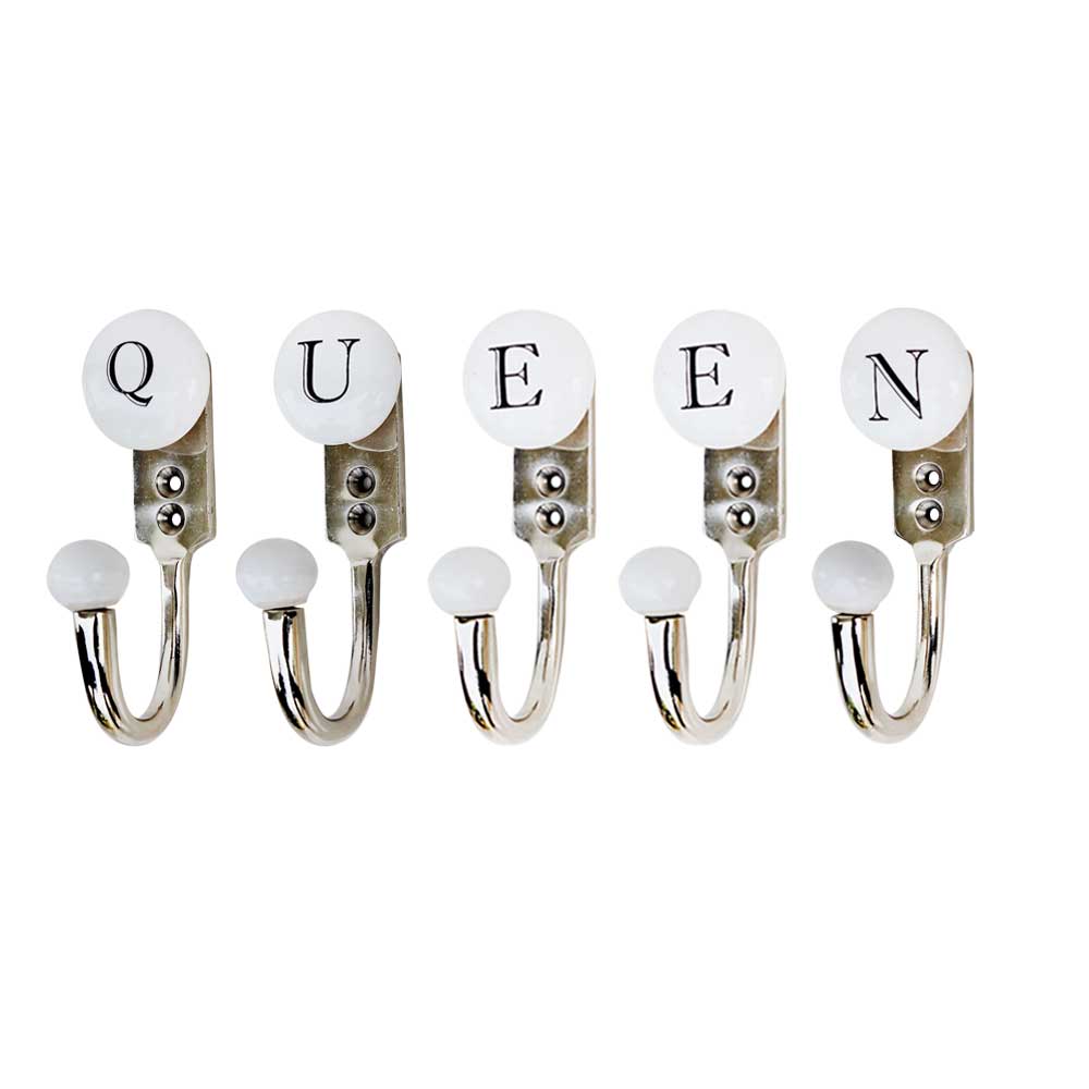 QUEEN white and black alphabet hooks (combo pack). When put on wall or cabinet it is an art in itself. This hook is strong enough to hold your keys, tea cups, hand towels, cloths etc.